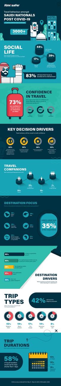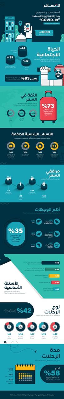 تصدر السفر إلى دول مجلس التعاون الخليجي السفر المحلي (35%) بشكل طفيف، حيث أعرب 27% من المسافرين عن رغبتهم في السفر خارج المملكة إلى الدول المجاورة، أما بالنسبة للوجهات البعيدة، فقد اختار 38% أيضًا السفر لدول آسيا كرحلة محتملة بعد الجائحة. ويبقى السفر برفقة أفراد الأسرة خيارًا مفضلًا لـ50% من السعوديين، بينما فضل 29% منهم السفر بمجموعات أصغر من الأصدقاء تماشيًا مع مفاهيم التباعد الاجتماعي.
