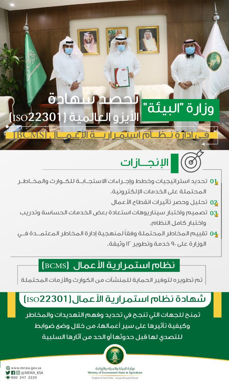 حصلت وزارة البيئة والمياه والزراعة، على شهادة الآيزو العالمية (ISO22301) في إدارة نظام استمرارية الأعمال (BCMS).