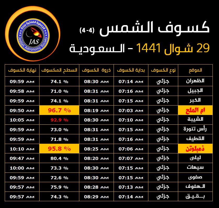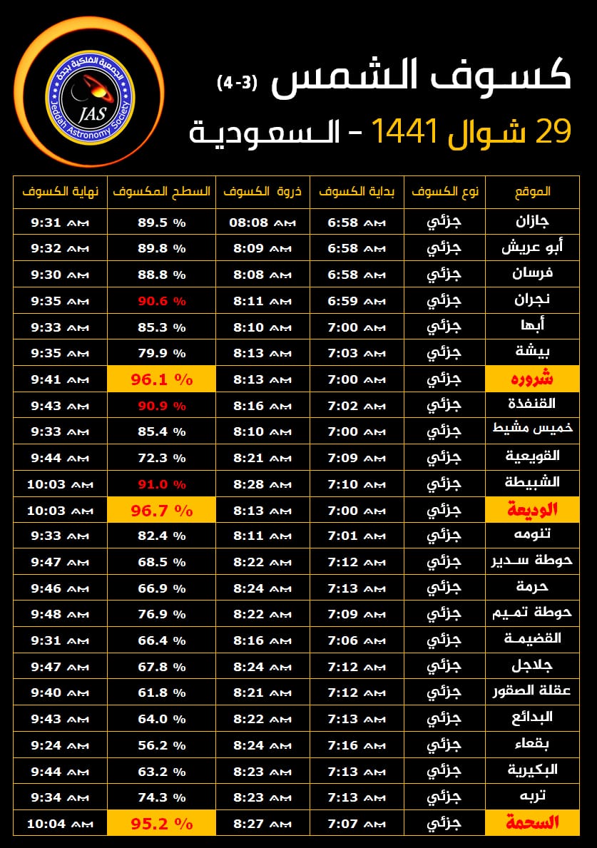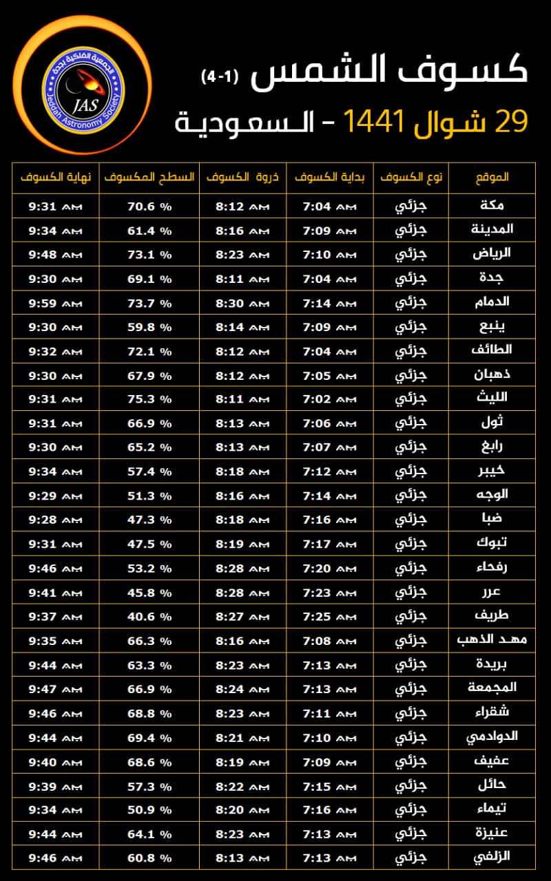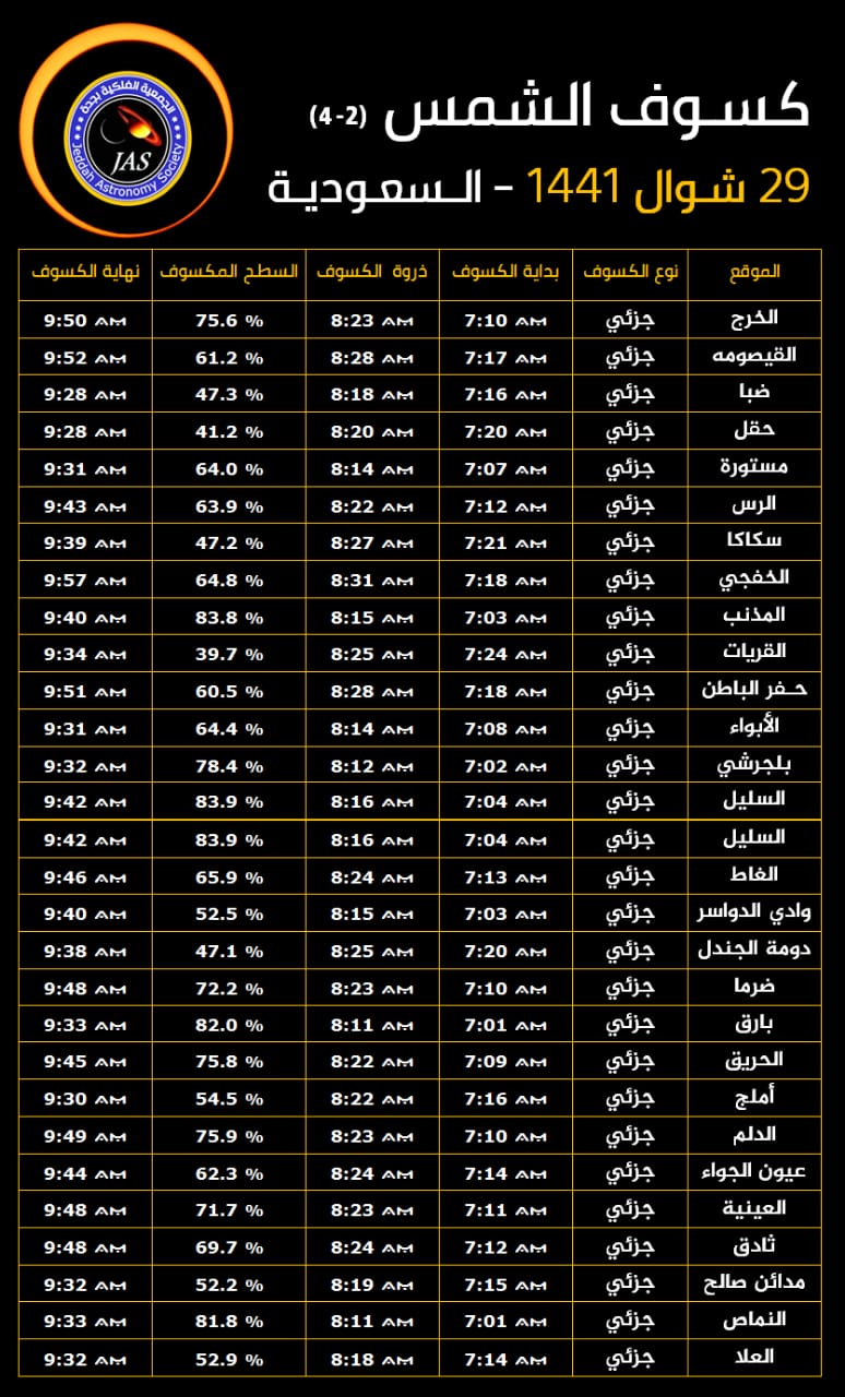 قال رئيس الجمعية الفلكية بجدة المهندس ماجد ابو زاهرة أن النصف الشرقي من الكرة الارضية سيشهد صبيحة يوم الأحد 29 شوال 1441 الموافق (21 يونيو 2020) أول كسوف للشمس هذا العام يرصد حلقياً في شريط ضيق اقصى جنوب وجنوب شرق السعودية واليمن وسلطنة عُمان في حين يشاهد جزئياً بنسب متفاوتة في مساحات واسعة من الوطن العربي.