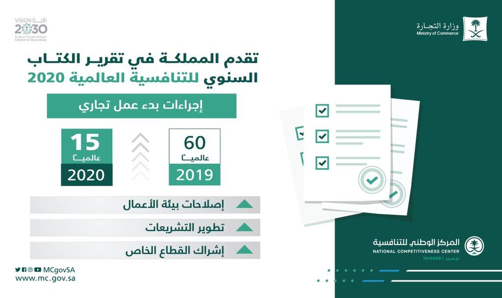 حققت المملكة العربية السعودية أفضل ترتيب في تقرير الكتاب السنوي للتنافسية العالمية للعام 2020 والصادر عن مركز التنافسية العالمي وذلك من بين 63 دولة هي الأكثر تنافسية في العالم.