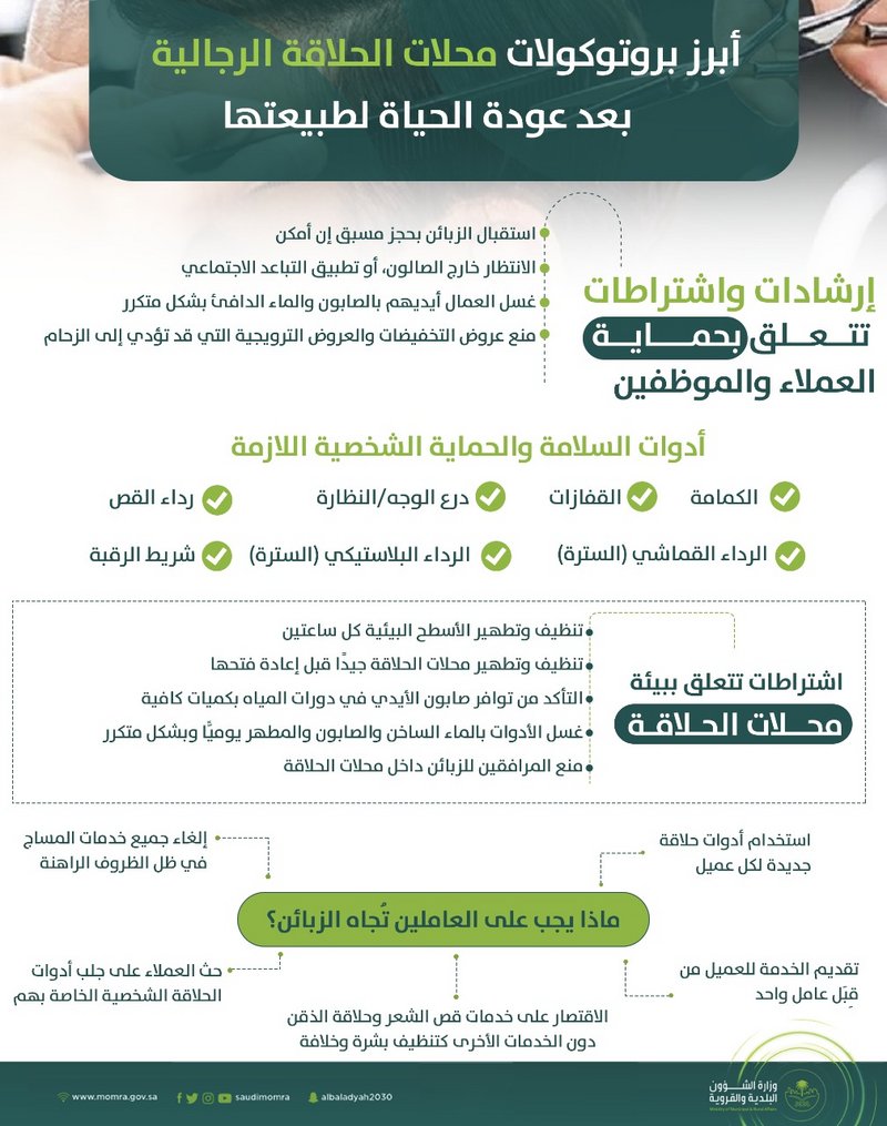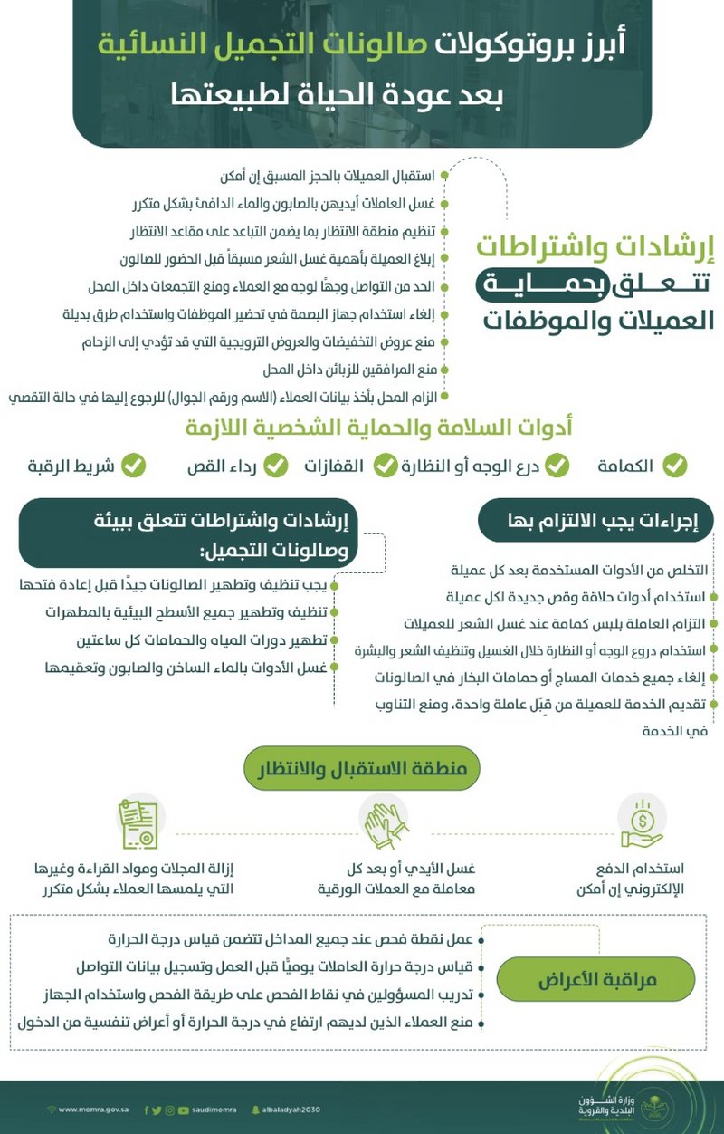 شاهد: انفوجرافيك لبروتوكولات محلات الحلاقة الرجالية وصالونات التجميل النسائية https://www.alshaamal.com/?p=103669 تم النشر في: 20 يونيو، 2020 5:54 م 289250 صحيفة الشمال الإلكترونية عبدالرحمن بن مرشد نشرت وزارة الشؤون البلدية والقروية تفاصيل بروتوكولات محلات الحلاقة الرجالية وصالونات التجميل النسائية والتي ستعود لعملها ابتداء من يوم غد الأحد.