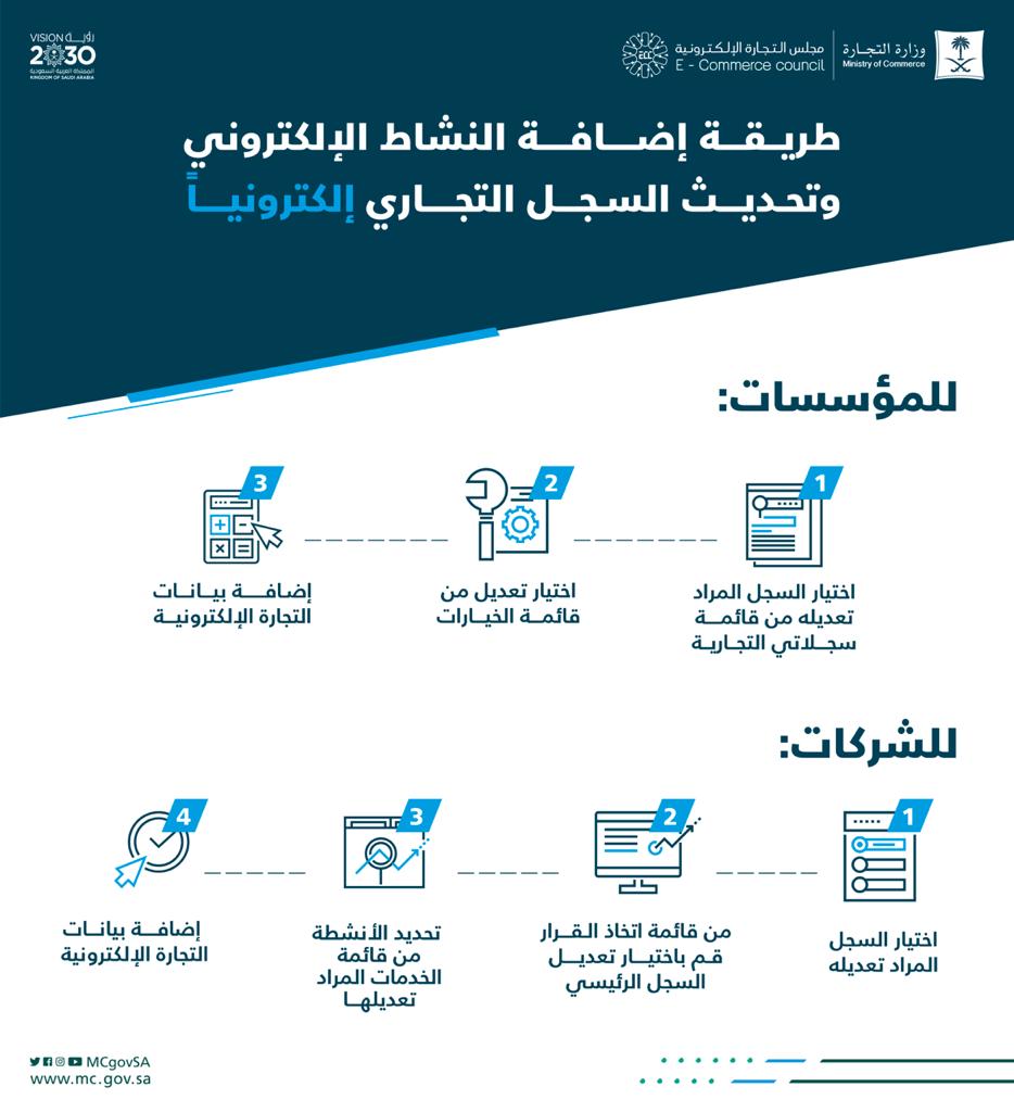 دعت وزارة التجارة عموم الشركات والمؤسسات المزاولة لأنشطة التجارة الإلكترونية إلى إضافة بيانات متاجرها الإلكترونية عبر خدمة تحديث بيانات السجلات التجارية عبر الرابط: e.mci.gov.sa وذلك تطبيقاً لما نص عليه نظام التجارة الإلكترونية ولائحته التنفيذية.