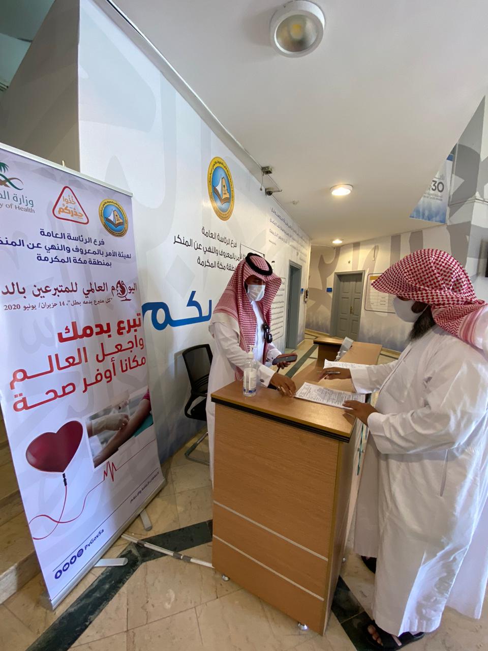 في إطار التعاون المجتمعي بين فرع الرئاسة العامة لهيئة الأمر بالمعروف والنهي عن المنكر بمنطقة مكة المكرمة والمديرية العامة للشؤون الصحية بالمنطقة شارك فرع الرئاسة العامة لهيئة الأمر بالمعروف والنهى عن المنكر بمنطقة مكة المكرمة في حملة – ( كل متبرع بدمه بطل ) – بعد التنسيق مع بنك الدم بمكة المكرمة .