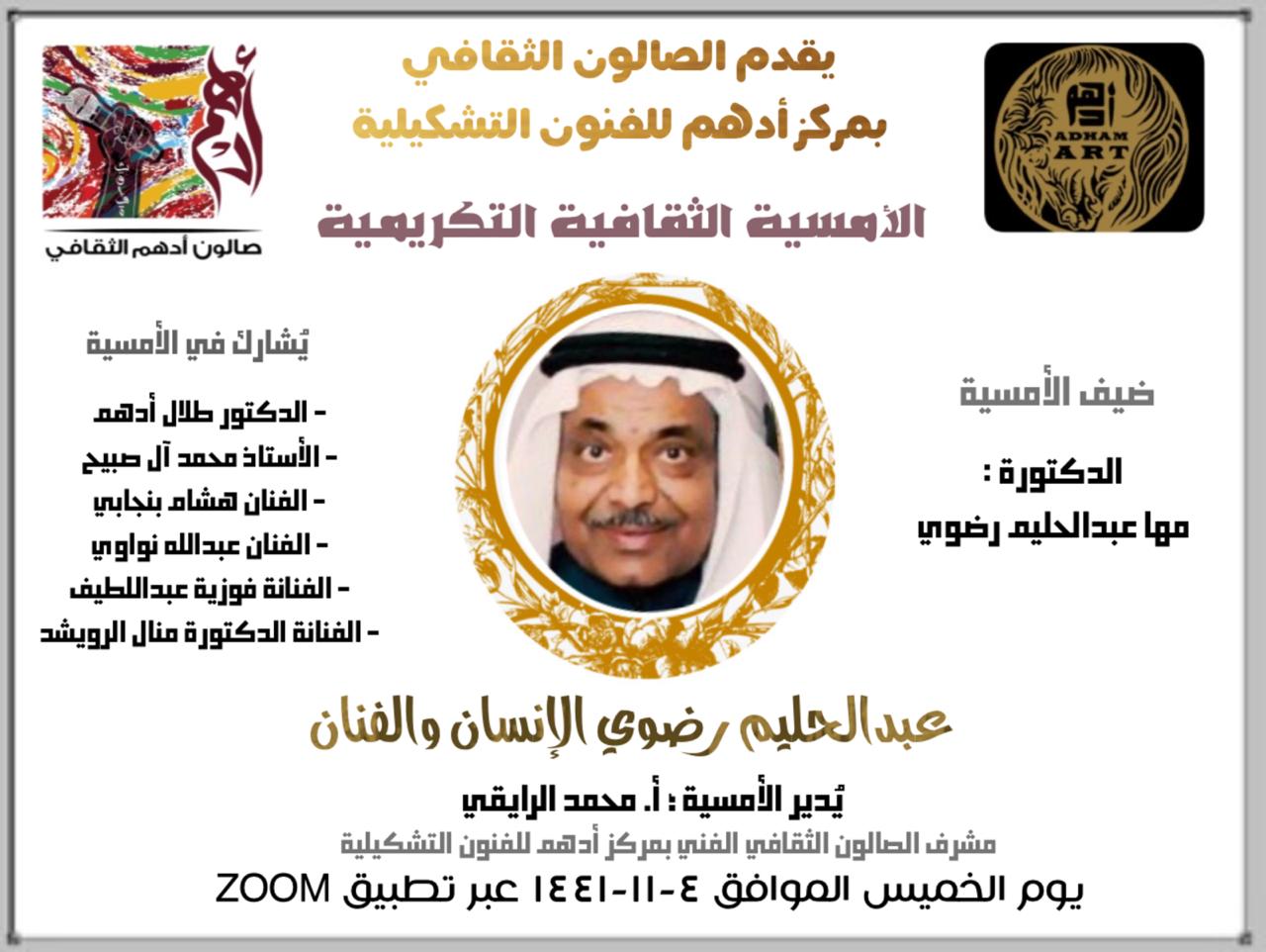 انطلقت أولى أمسيات الصالون الثقافى الفني بمركز أدهم للفنون التشكيلية بجدة مساء الخميس 2020/6/25 والتي كانت بعنوان “عبدالحليم رضوي الإنسان والفنان” يرحمه الله