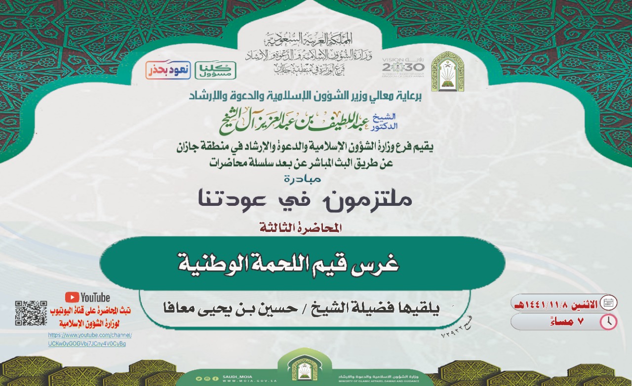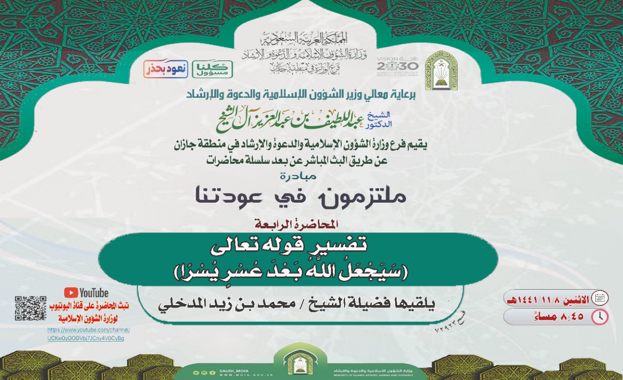 نظم فرع وزارة الشؤون الإسلامية والدعوة والإرشاد بمنطقة جازان أمس، محاضرتين وعظيتين ضمن مبادرة “ملتزمون في عودتنا”، الأولى بعنوان ” غرس قيم اللحمة الوطنية “، ومحاضرة لتفسير قوله تعالى: {سيجعل الله بعد عسرٍ يسرا}، حيث تم بثها عبر قناة الوزارة على اليوتيوب.