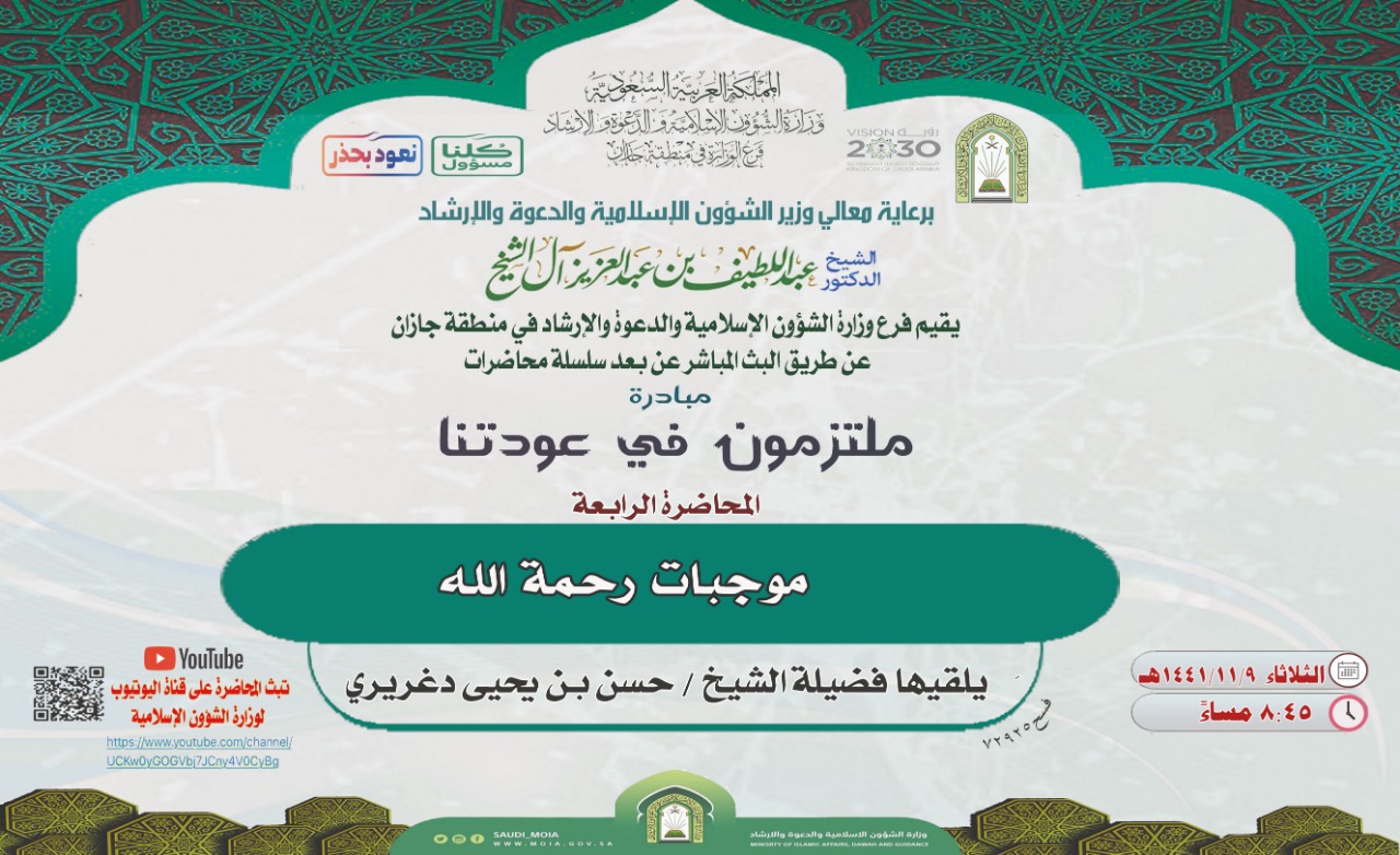 وتأتي هذه المحاضرات ضمن مبادرة “ملتزمون في عودتنا”، حيث بدأت يوم السبت الماضي برعاية معالي وزير الشؤون الإسلامية والدعوة والإرشاد الشيخ الدكتور عبداللطيف بن عبدالعزيز آل الشيخ، وتتناول موضوعات متنوعة تحث في مجملها على الأخذ بالإجراءات الاحترازية لتوقي وباء كورونا، والواجب الشرعي تجاه المحافظة على أمن المجتمع وسلامته.