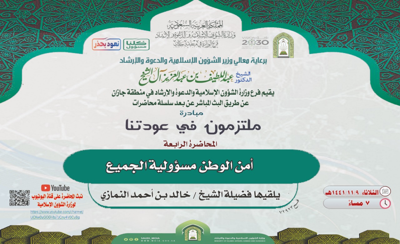 وتأتي هذه المحاضرات ضمن مبادرة “ملتزمون في عودتنا”، حيث بدأت يوم السبت الماضي برعاية معالي وزير الشؤون الإسلامية والدعوة والإرشاد الشيخ الدكتور عبداللطيف بن عبدالعزيز آل الشيخ، وتتناول موضوعات متنوعة تحث في مجملها على الأخذ بالإجراءات الاحترازية لتوقي وباء كورونا، والواجب الشرعي تجاه المحافظة على أمن المجتمع وسلامته.