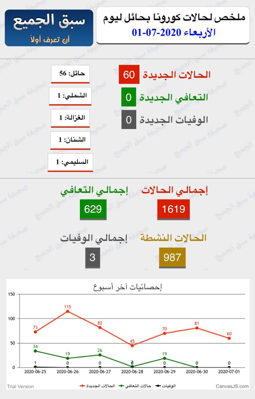 ( حائل: 56 حالة – الغزالة حالة واحدة – الشنان حالة واحدة – الشملي حالة واحدة – السليمي حالة واحدة ) ليصل إجمالي الحالات المصابة في منطقة حائل إلى 1619 حالة).