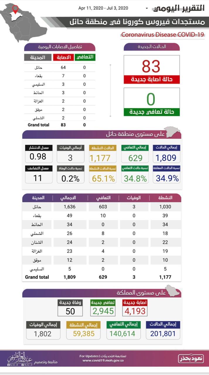 ( حائل: 64 حالة – بقعاء 7 حالات – الحائط 3 حالات – السليمي 3 حالات – الشملي 2 حالة – الغزالة 2 حالة – موقق 2 حالة) ليصل إجمالي الحالات المصابة في منطقة حائل إلى 1809 حالة).