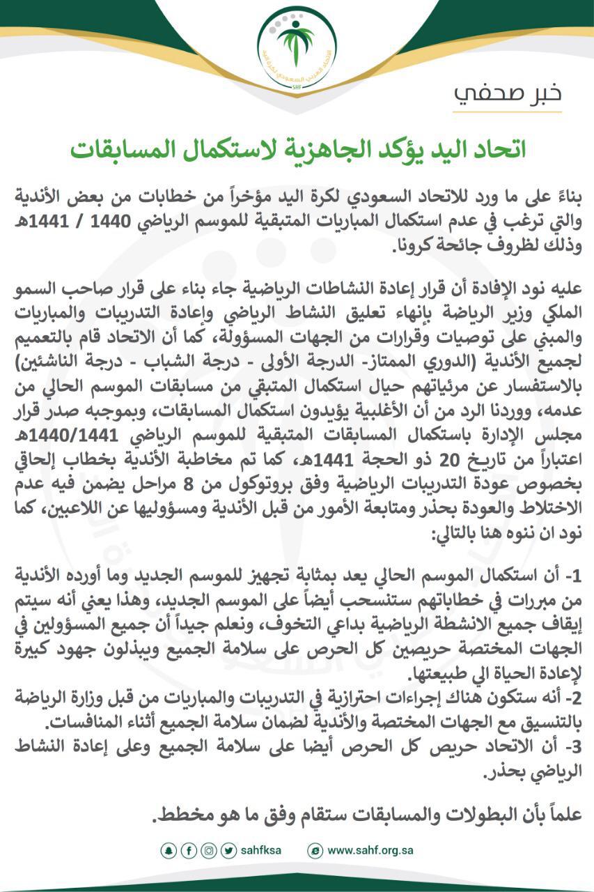 واوضح الاتحاد انه قام بالتعميم لجميع الأندية (الدوري الممتاز- الدرجة الأولى – درجة الشباب – درجة الناشئين) بالاستفسار عن مرئياتهم حيال استكمال المتبقي من مسابقات الموسم الحالي من عدمه، ووردنا الرد من أن الأغلبية يؤيدون استكمال المسابقات، وبموجبه صدر قرار مجلس الإدارة باستكمال المسابقات المتبقية للموسم الرياضي 1440/1441هـ اعتباراً من تاريخ 20 ذو الحجة 1441هـ، كما تم مخاطبة الأندية بخطاب إلحاقي بخصوص عودة التدريبات الرياضية وفق بروتوكول من 8 مراحل يضمن فيه عدم الاختلاط والعودة بحذر ومتابعة الأمور من قبل الأندية ومسؤوليها عن اللاعبين، كما نود ان ننوه هنا بالتالي:
