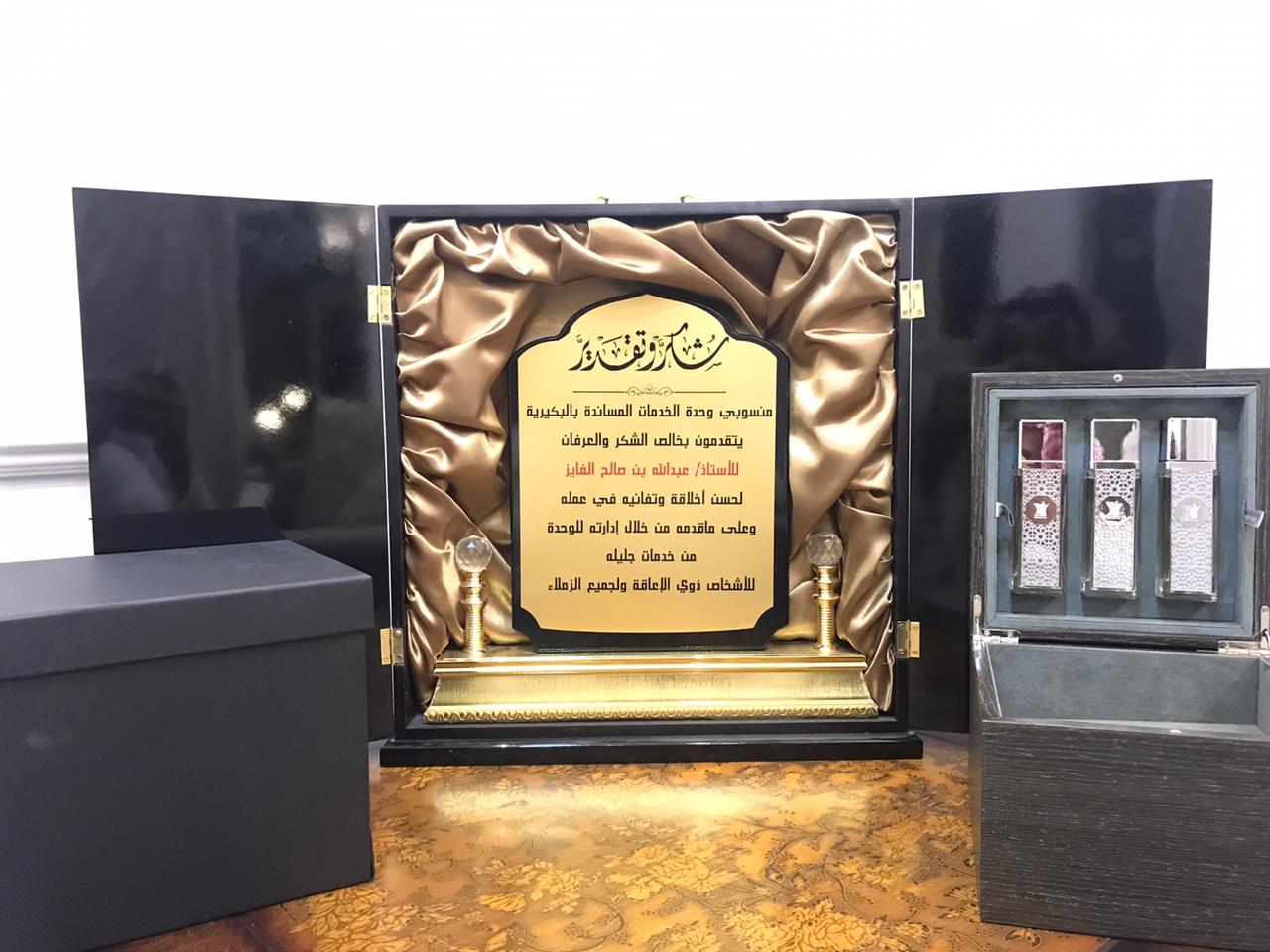 كرَّم منسوبي وحدة الخدمات المساندة في البكيرية اليوم الاثنين الموافق 2020/07/06م مدير وحدة الخدمات المساندة للاشخاص ذوي الاعاقة في محافظة البكيرية سابقاً الاستاذ/ عبدالله بن صالح الفايز ، وذلك في حفل رسمي أقيم في مدينة الخبراء ، وحضور عدد من مدراء الاقسام والزملاء في وزارة الموارد البشرية والتنمية الاجتماعية ومنسوبيها.