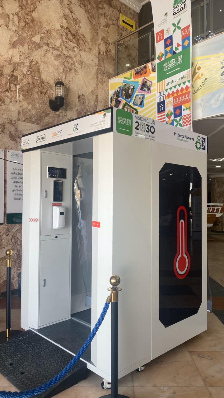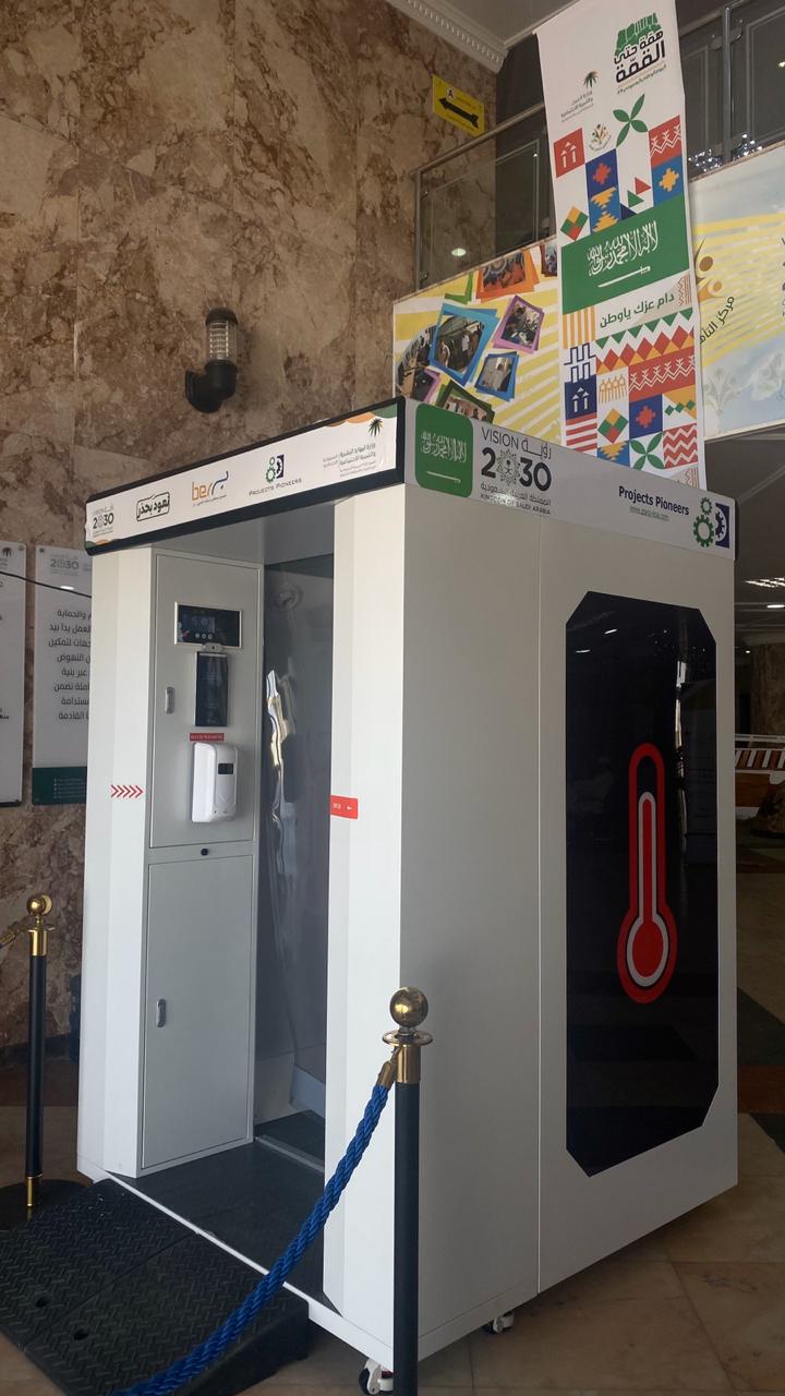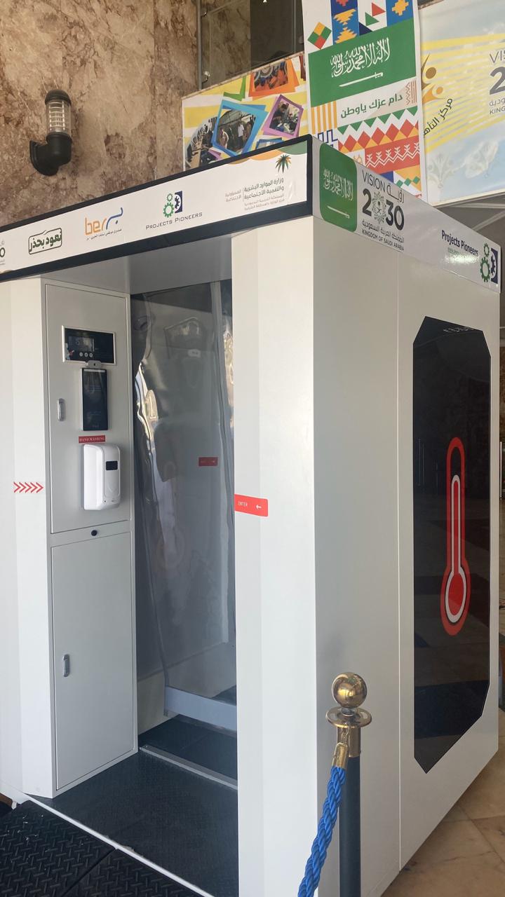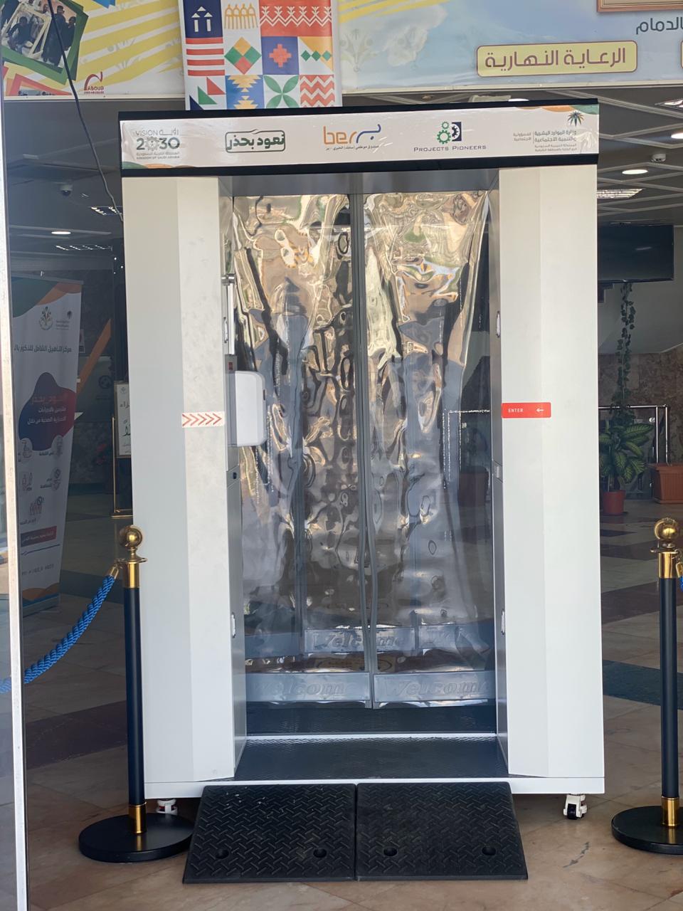 مبينا بأن الأجهزة تم وضعها عند المداخل الرئيسية، حفاظاً على سلامة الجميع فهي تعمل بصفة إلكترونية وتلقائية وبدون لمس، مثل جهاز قياس الحرارة، جهاز تعقيم اليدين، التعقيم الشامل، نظام تبخير بتقنية الضباب لزيادة كفاءة التعقيم والسلامة، وتتحمل الحرارة إلى 35 درجة مئوية وملحق بالجهاز منبه أوتوماتيكي يعمل حال رصد شخص درجة حرارته عالية.