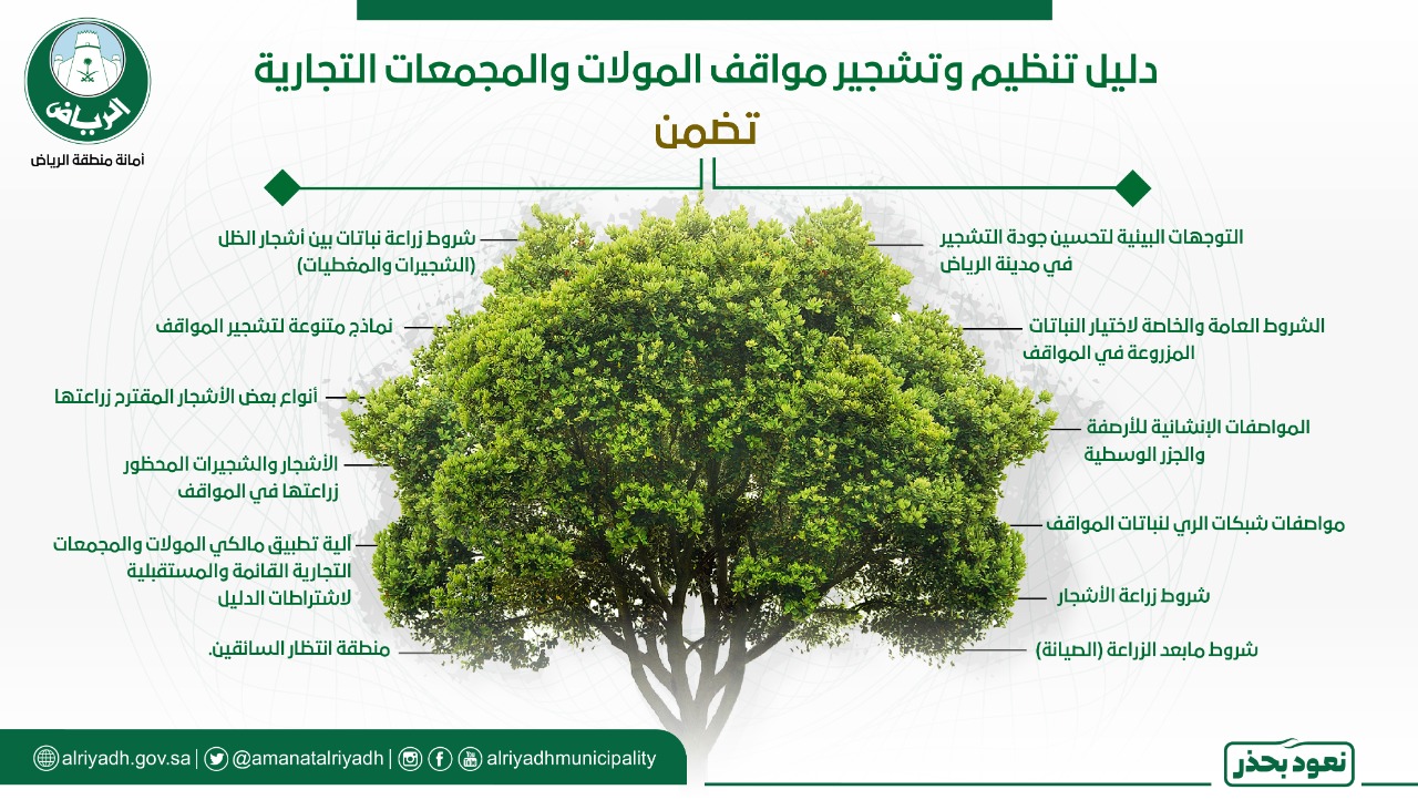 واقترح مجموعة من الأشجار الصالحة للزراعة في مدينة الرياض، كاللبخ والبونسيانا والخبازي الساحلي والأكاسيا، واضعًا أنواع أخرى ضمن قائمة الأشجار المحظورة لعدم ملاءمتها للمدينة وما قد تسببه من أذى للمشاة كالنباتات الشوكية، مسلطًا الضوء على مواصفات منطقة انتظار السائقين، تماشيًا مع متطلبات الأنسنة من خلال توفير مواقع ملائمة تسهم في التنظيم وتحسين المشهد الحضري، مع تحديد آلية تطبيق مالكي المولات والمجمعات التجارية القائمة والمستقبلية للاشتراطات المحددة.
