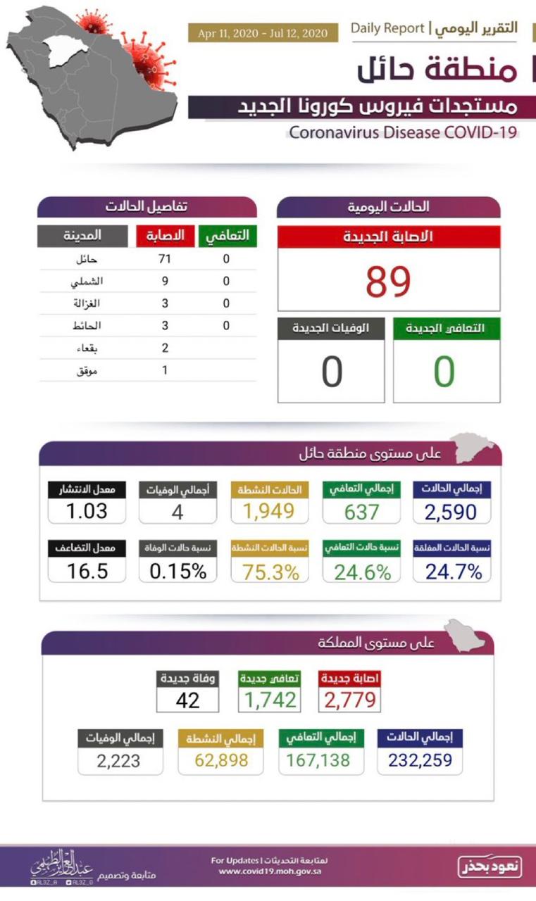 وأكدت وزارة الصحة أن العدد الإجمالي للإصابات بمنطقة حائل وصل إلى 2590 حالة.
