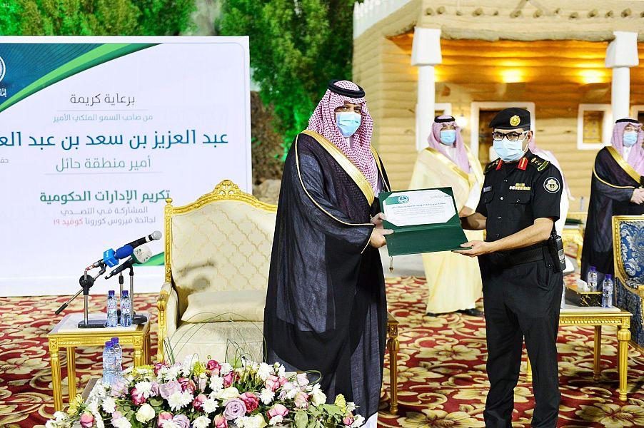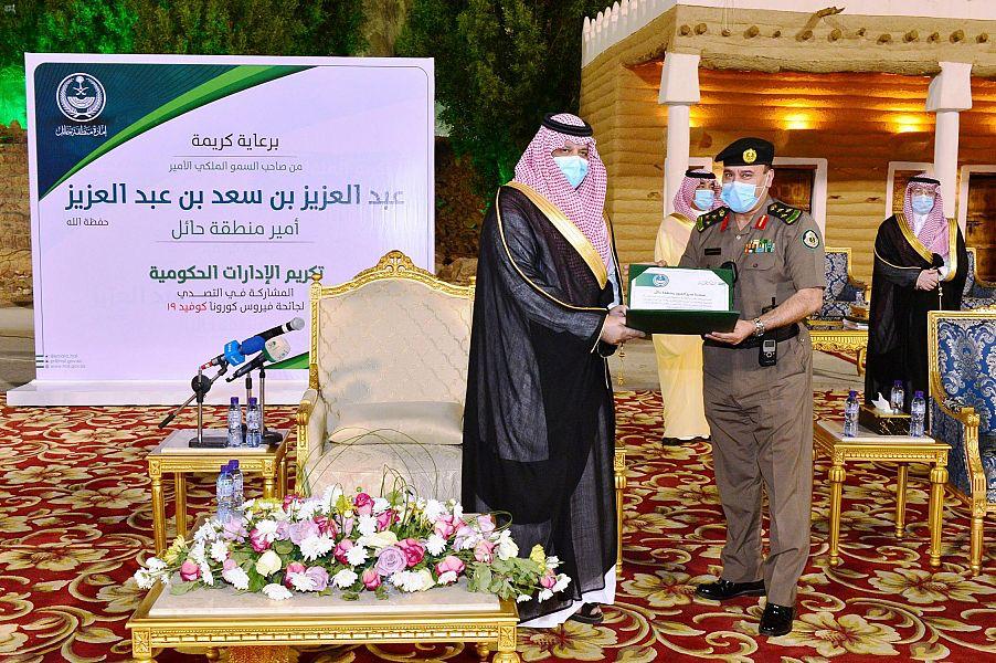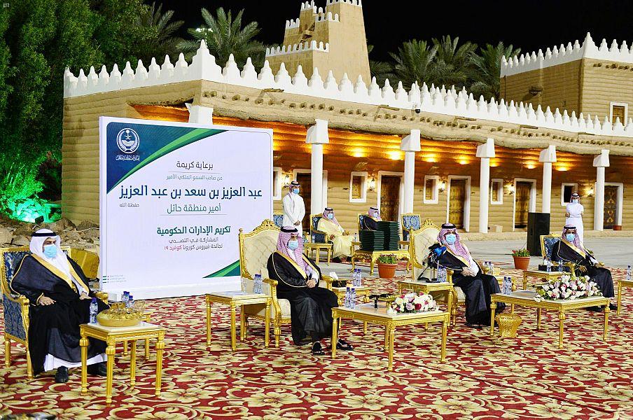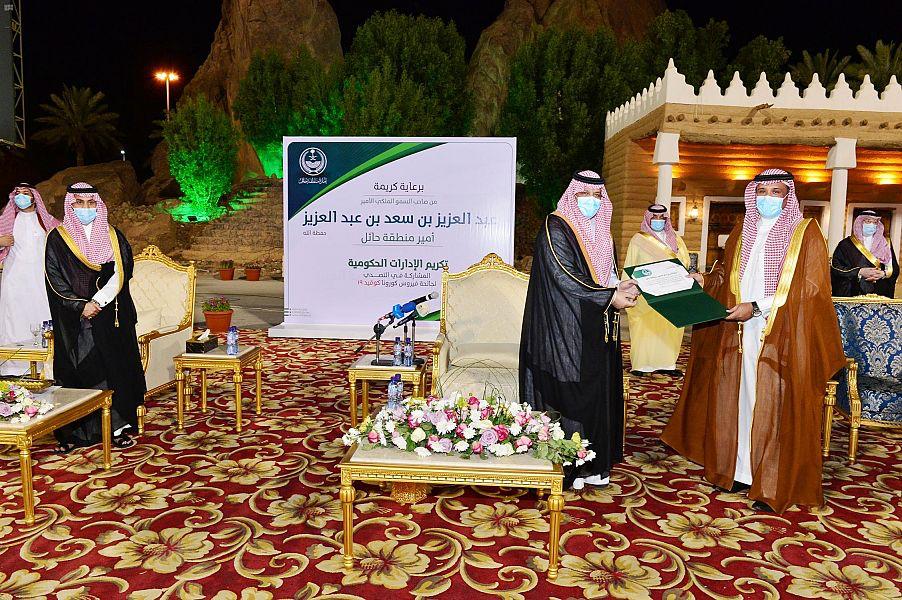 وفي ختام الحفل كرم أمير منطقة حائل الجهات كافة المشاركة في التصدي لجائحة كورونا (كوفيد 19).