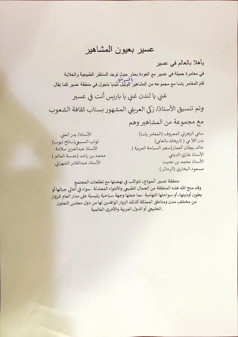 في أول مغامرة جميلة في عسير مع العودة بحذر حيث نجد المناظر الطبيعية والخلابة قام المغامر ياسابجولة مع مجموعة من مشاهير السوشي الميديا بجولة في منطقة عسير مرددين