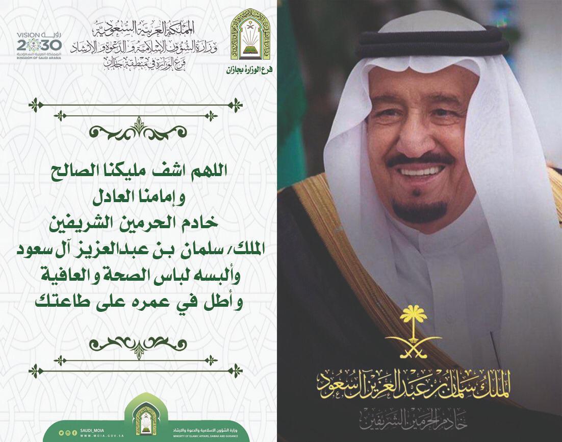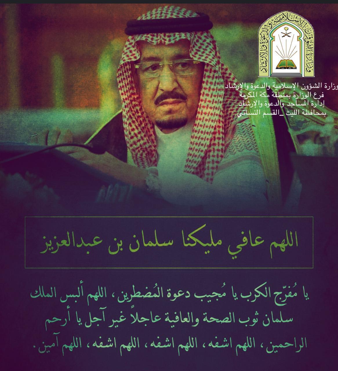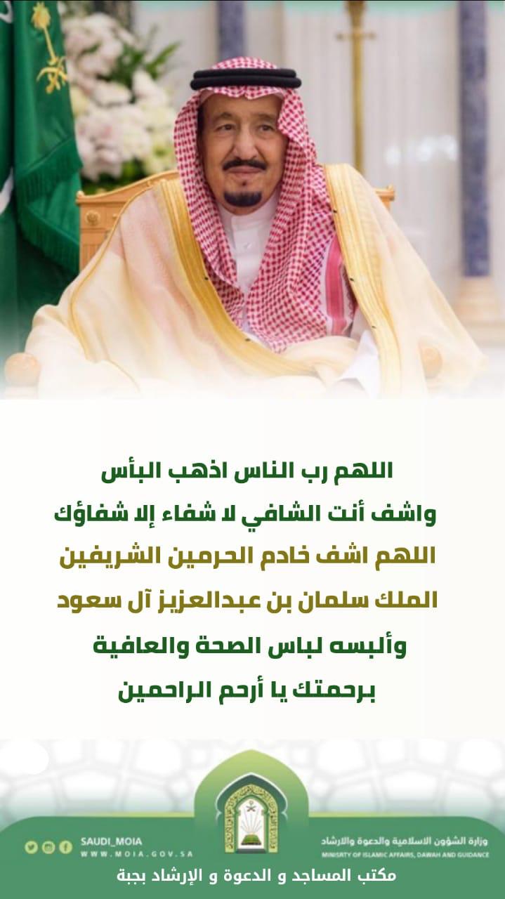 نشرت وزارة الشؤون الإسلامية والدعوة والإرشاد عدداً من التصاميم عبر الشاشات الإلكترونية المنتشرة في أروقة الوزارة وفروعها وقطاعاتها المتعددة، والتي تضمنت عبارات الدعاء والابتهال إلى الله تعالى، بأن يشفي خادم الحرمين الشريفين الملك سلمان بن عبدالعزيز -حفظه الله-، وذلك عقب بيان عن الديوان الملكي عن دخوله مستشفى الملك فيصل التخصصي بالرياض، لإجراء بعض الفحوصات الطبية جرّاء وجود التهاب في المرارة.