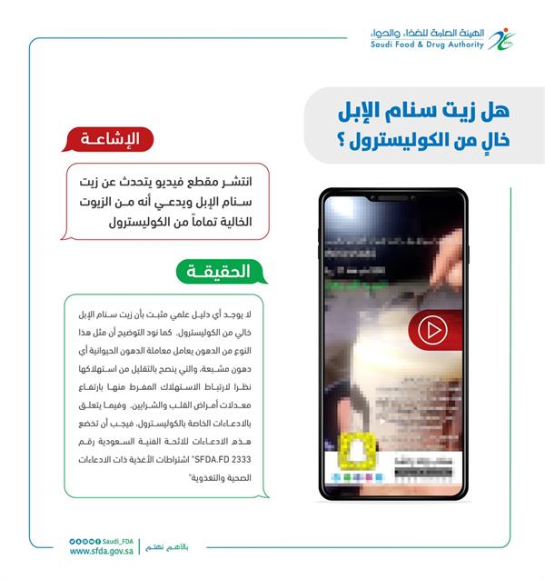 وقالت الهيئة إنه لا يوجد أي دليل علمي مثبت بأن زيت “سنام الإبل” خالٍ من الكوليسترول، لافتة إلى أن مثل هذا النوع من الدهون يعامَل معاملة الدهون الحيوانية، أي دهون مشبعة.