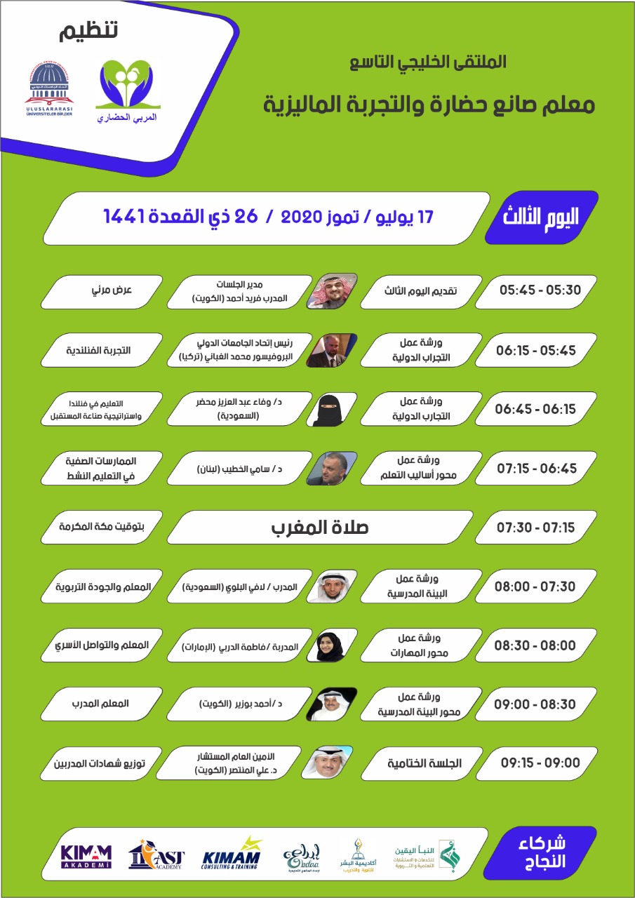 اختتمت فعاليات الملتقى الخليجي التاسع الإفتراضي الذي نظمة المربي الحضاري واكاديميه حضاره واتحاد الجامعات الدولي الذي عُقد تحت عنوان ( معلم صانع حضارة والتجربة الماليزية) والذي استمرت فعالياته على مدى 5 أيام.
