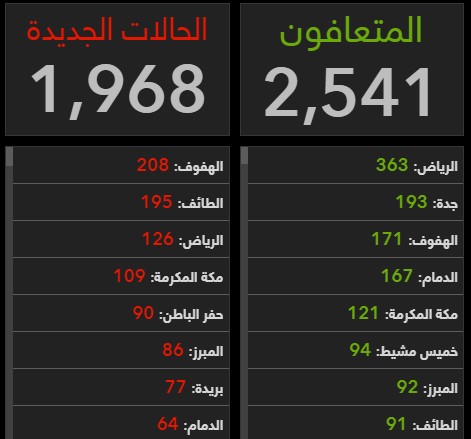 «الصحة»: تسجيل 1968 إصابة جديدة بـ«كورونا» و2541 حالة تعافي خلال الـ24 ساعة الماضية https://www.alshaamal.com/?p=108068 تم النشر في: 26 يوليو، 2020 3:21 م 273390 صحيفة الشمال الإلكترونية فريق التحرير أعلنت وزارة الصحة، اليوم الأحد، تسجيل 1968 حالة إصابة جديدة بفيروس كورونا (كوفيد-19) خلال الـ24 ساعة الماضية في المملكة.وأضافت “الصحة” أنه تم تسجيل 2541 حالة تعافي من كورونا، بينما تم تسجيل 30 حالة وفاة.
