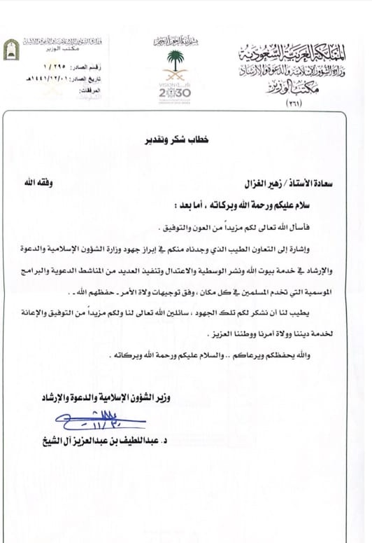 تلقى الزميل – زهير بن جمعة الغزال الاعلامي بالمنطقة الشرقية خطاب شكر وتقدير من وزير الشؤون الإسلامية والدعوة والإرشاد الدكتور – عبداللطيف بن عبدالعزيز آل الشيخ وذلك نظير إبراز جهود وزارة الشؤون الإسلامية والدعوة والإرشاد في خدمة بيوت الله تعالى ونشر الوسطية والاعتدال وتنفيذ العديد من المناشط الدعوية والبرامج الموسمية التي تخدم المسلمين في كل مكان .