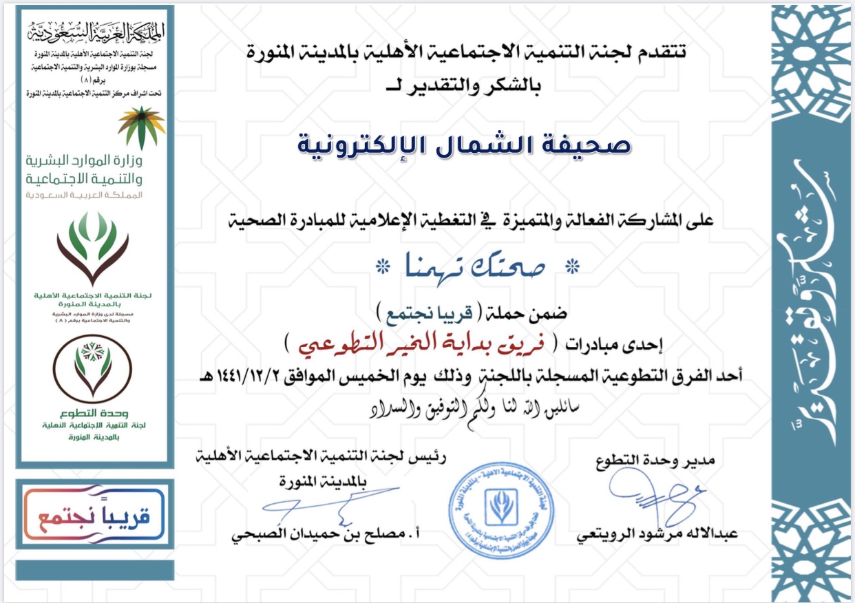 قدمت لجنة التنمية الاجتماعية بالمدينة المنورة؛ بالشكر والتقدير لــ”صحيفة الشمال” وذلك على المشاركة الفعالة والمتميزة في التغطية الإعلامية للمبادرة الصحية “صحتك تهمنا”.