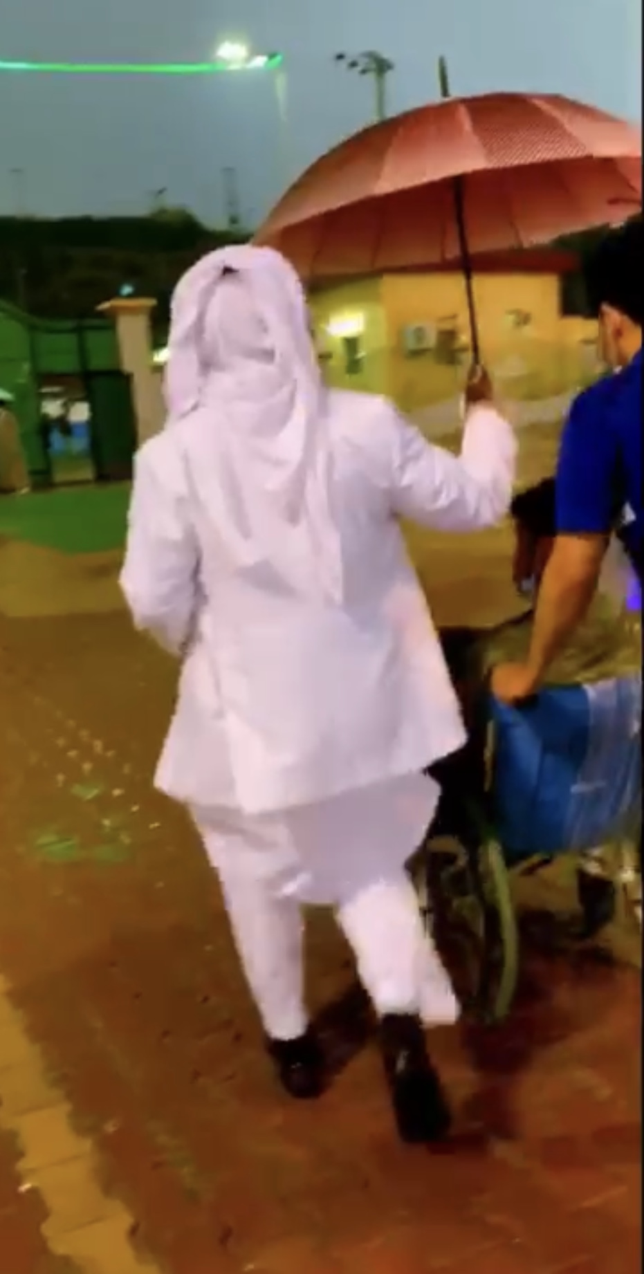 قام حارس الأمن جمعان الزهراني بتغطية أحد ذوي الاحتياجات الخاصة عن المطر ، وذلك بعد هطول الأمطار التي تشهدها منطقة الباحة هذه الأيام .