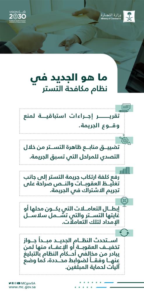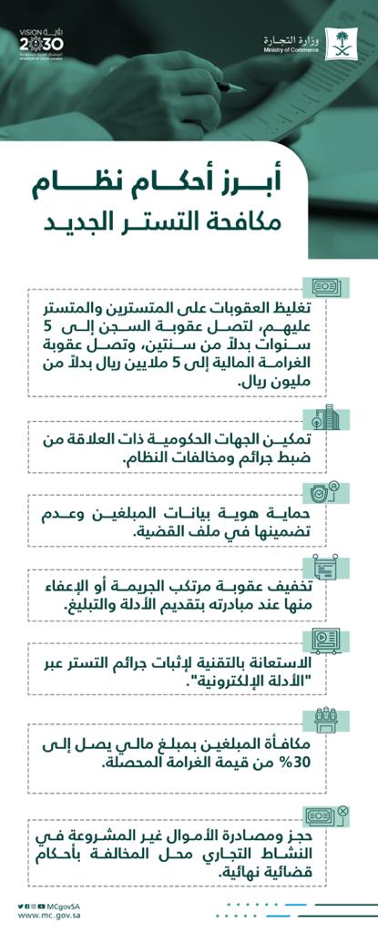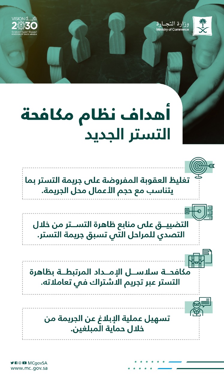 يشار إلى أن النظام الجديد لمكافحة التستر يسهم في تحفيز المنشآت الصغيرة والمتوسطة ويحمي المستهلكين من الآثار السلبية للتستر، وتختص وزارة التجارة بالرقابة على المنشآت وتلقي البلاغات وضبط الجرائم والمخالفات المنصوص عليها في النظام.