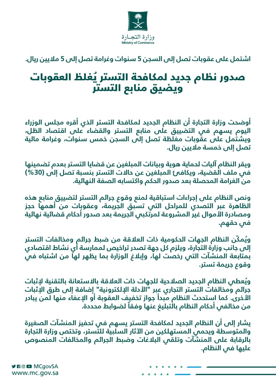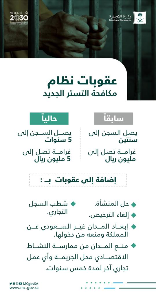 أوضحت وزارة التجارة أن النظام الجديد لمكافحة التستر الذي أقره مجلس الوزراء اليوم يسهم في التضييق على منابع التستر والقضاء على اقتصاد الظل، ويشتمل على عقوبات مغلظة تصل إلى السجن خمس سنوات، وغرامة مالية تصل إلى خمسة ملايين ريال.