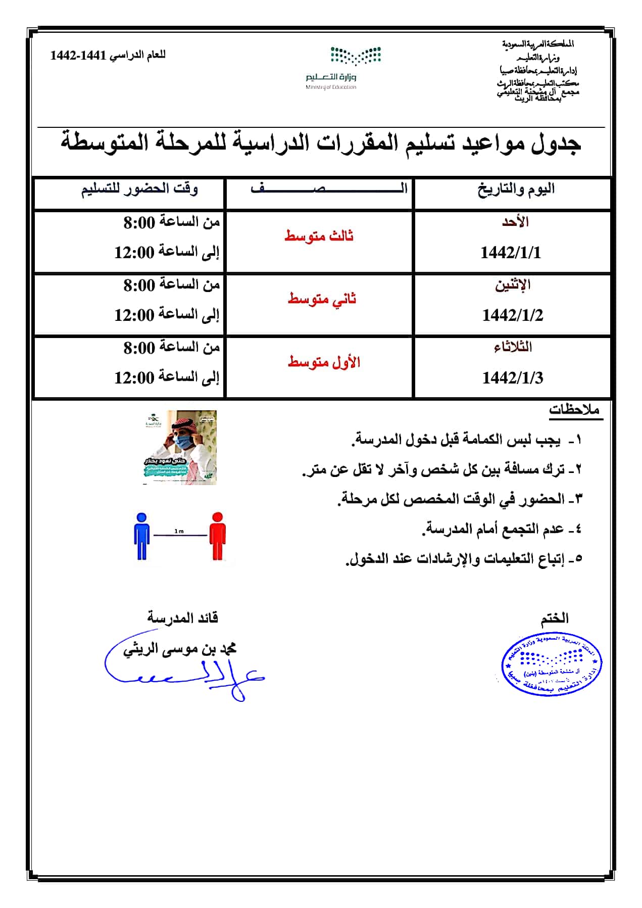 – الثلاثاء 1442/1/3 هــ – الصف الأول متوسط – من الساعة 8 صباحاً حتى الساعة 12 ظهراً .