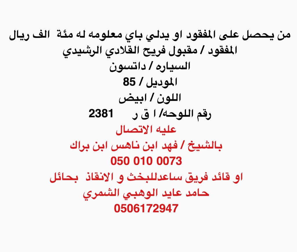 أعلن الشيخ فهد بن ناهس البراك عن صرفه مبلغ مائة ألف ريال، لمن يبلغ أو يدلي بأي معلومة عن مكان المفقود “مقبول فريح القلادي الرشيدي.