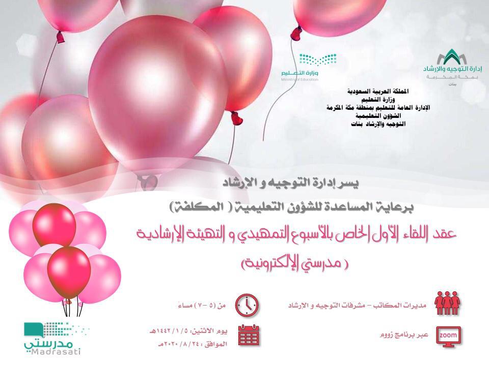 عقدت الإدارة العامة للتعليم بمنطقة مكة المكرمة ممثلة في إدارة التوجيه والإرشاد اللقاء الإرشادي الأول” مدرستي الافتراضية” للأسبوع التمهيدي و التهيئة الإرشادية للطالبات عن بعد وذلك اليوم الاثنين الموافق 1442/1/5هـ ، نفذته وحدة الإرشاد التربوي تحت إشرف مديرة الإدارة حورية اللحياني وبحضور مساعدة المدير العام للشؤون التعليمية الأستاذة لمياء بنت عبدالعزيز بشاوري .