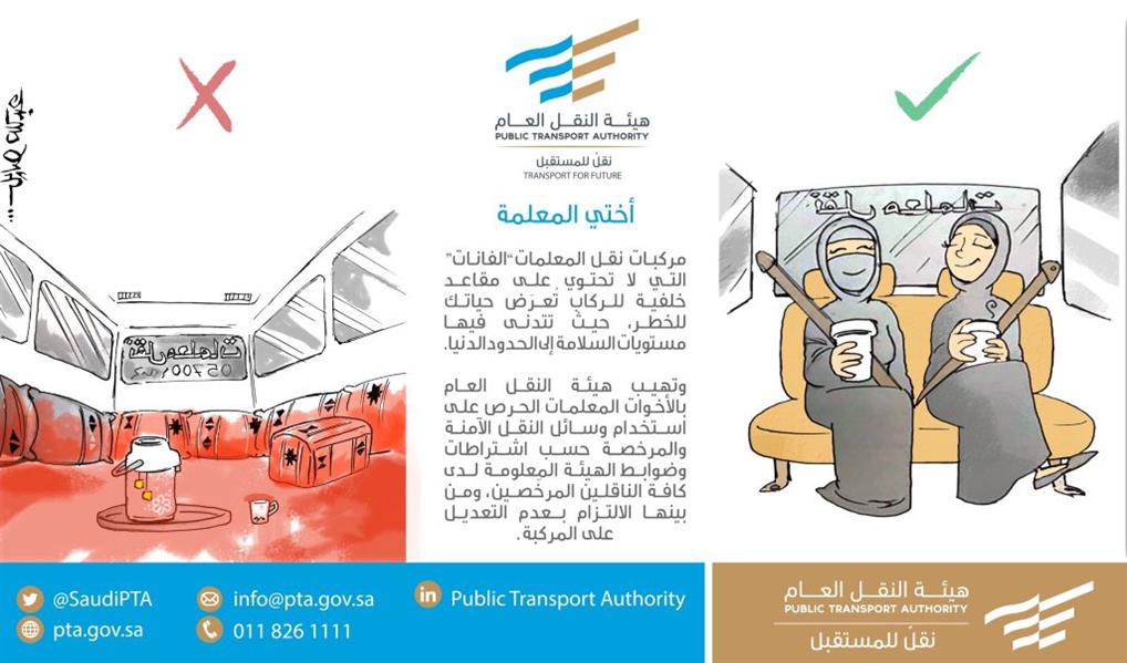 حذرت هيئة النقل العام، مساء اليوم الأحد، المعلمات من المركبات التي تقلهم من نوع “فان” والتي لا تحتوي على مقاعد خلفية.