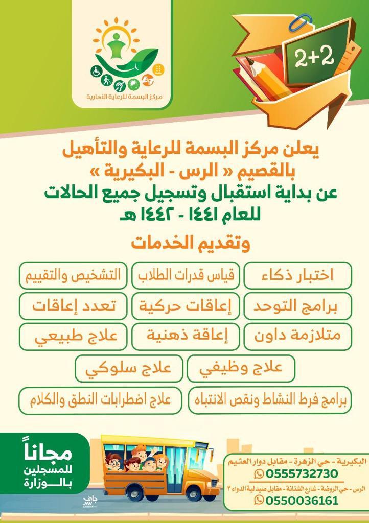 أعلن مركز البسمة للرعاية والتأهيل في القصيم (الرس – البكيرية) عن بداية استقبال وتسجيل الحالات للعام 1441-1442هـ .