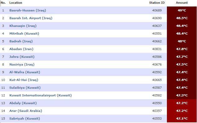 وجاءت مدينة عرعر في المرتبة الرابعة عشرة بعد عدة مدن عراقية وكويتية بدرجة حرارة بلغت 47.2 مئوية، في مقدمتها مدينة البصرة العراقية ومنطقة مطربة في الكويت.