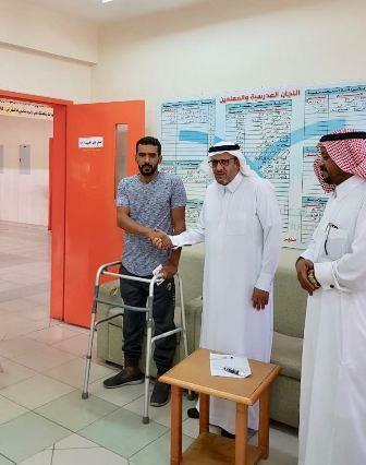 وقرر المعلم حسن بن سلمان العمراني معلم التربية الفنية بمدرسة عمير بن وهب، قطع إجازة طبية منحت له وحضر إلى المدرسة مع بداية العامة الدراسي أمس الأحد لممارسة عمله بين طلابه، حيث ظهر مستنداً على عكازه خلال حضوره للمدرسة.