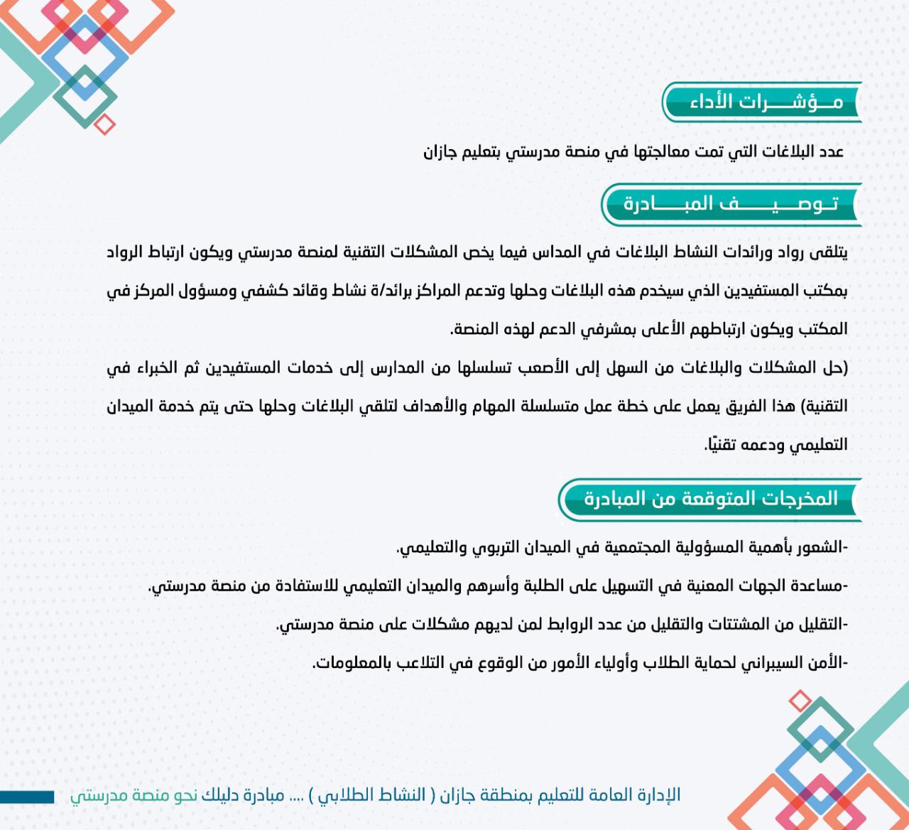 أطلقت الإدارة العامة للتعليم بمنطقة جازان مبادرة (دليلك نحو منصة مدرستي) والتي تهدف لمساندة الطلاب والطالبات وأولياء الامور في التسجيل في منصة مدرستي للتعليم عن بعد وتقديم الدعم اللازم لهم للاستفادة من الخدمات المقدمة فيها .