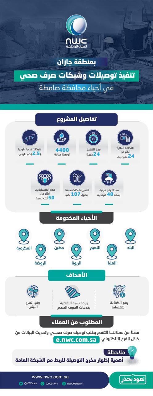 أعلنت شركة المياه الوطنية ممثلة بالإدارة العامة لخدمات المياه في منطقة جازان، عن بدء تنفيذ مشروع التوصيلات المنزلية وشبكات الصرف الصحي في عدد من أحياء مدينة صامطة، وذلك بتكلفة مالية بلغت أكثر من 24 مليون ريال.