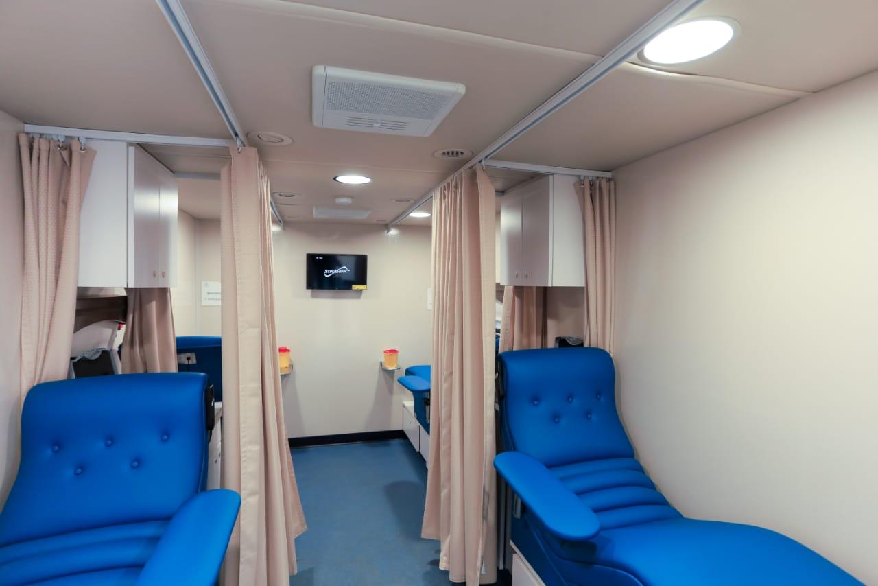 وتضم الوحدة المتنقلة ثلاجة بنك دم بسعة 5 قدم، ومنصة عمل مع مغسلة