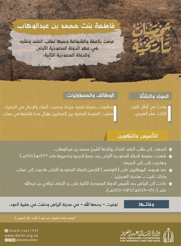 وأضافت الدارة أنها شهدت سقوط الدولة السعودية الأولى بعد حصار الدرعية وتدميرها عام 1233هـ، وبعدها هاجرت إلى رأس الخيمة، مشيرة إلى أنه بعد هجوم البريطانيين على القواسم التابعين للدولة السعودية الأولى هاجرت إلى عمان، ولذلك لقبت بـ”صاحبة الهجرتين”.