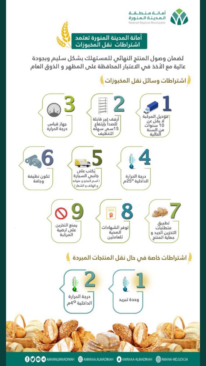 أطلقت أمانة منطقة المدينة المنورة مبادرة نوعية لتحسين وتطوير وسائل نقل المخبوزات وفق أعلى معايير سلامة نقل الأغذية لضمان وصول المنتج إلى المستهلك بشكل سليم وبجودة عالية، وحددت أمانة المنطقة مجموعة من المعايير الواجب توفرها في مركبات نقل المخبوزات وذلك وفقاً لمجموعة من الاشتراطات الصحية.