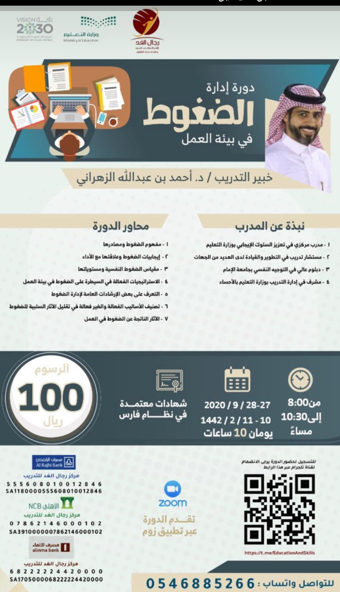 يقدم خبير التدريب الدكتور أحمد الزهراني دورة إدارة الضغوط عن طريق برنامج زوم.