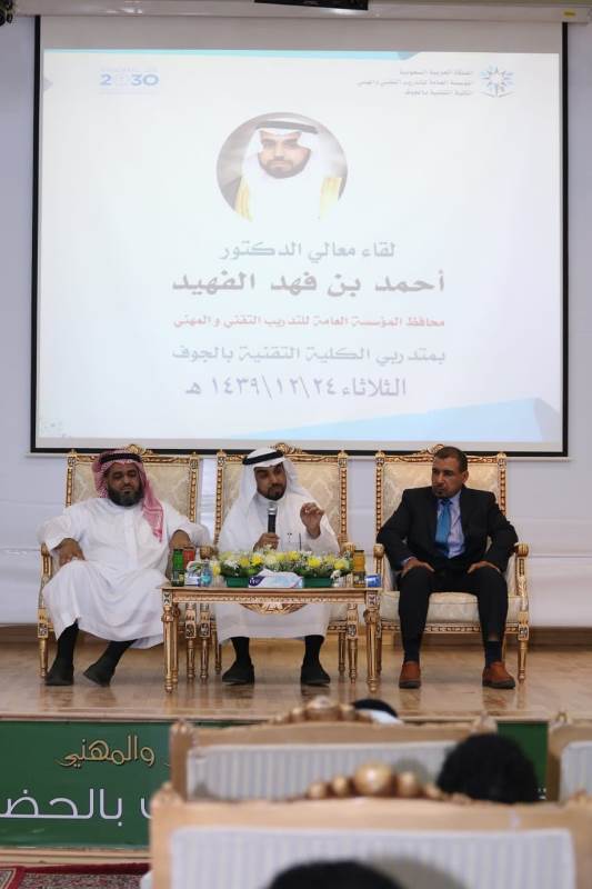 واطلع الدكتور الفهيد على سير العملية التدريبية في الكلية التقنية بالجوف ثم التقى بمتدربي الكلية التقنية بالجوف وأشاد خلال اللقاء بالدعم الكبير الذي تقدمه حكومتنا الرشيدة، بقيادة خادم الحرمين الشريفين الملك سلمان بن عبدالعزيز و ولي عهده الأمين– حفظهم الله لقطاع ومنسوبي التدريب التقني والمهني بالمملكة وأن الرؤية المباركة 2030 تركز على شباب الوطن الذين هم عماد المستقبل وحثهم على ضرورة الاستعانة بالله في مواجهة التحديات مؤكداً أن البلد يحتاج لهم وأن المؤسسة وطاقمها في خدمة المتدرب لصقل وتطوير قدراته في مجال العمل التقني والمهني واستمع الى المتدربين ورد على استفساراتهم. ثم التقى بأعضاء الهيئة التدريبية والادارية وتجول في رحاب الكلية حيث تفقد استراحات المتدربين مستمعًا لشرح من عميد الكلية الاستاذ علي بن سليم العبدالله عن توجه الكلية الى تحسين البيئة التدريبية والارتقاء بجودة الخدمات المقدمة للمستفيدين والمتدربين ثم افتتح المصرف التقني بالكلية الذي يمثل نقلة نوعية في التدريب المحاكي الفعلي لبيئة العمل في القطاع المصرفي واستمع لشرح فكرة انشاء وخدمات المصرف من الاستاذ صالح الحيزان رئيس قسم التقنية الادارية ثم غادر الكلية معبرا عن سعادته بالزيارة ، وبالتميز الذي تحظى به الكلية.