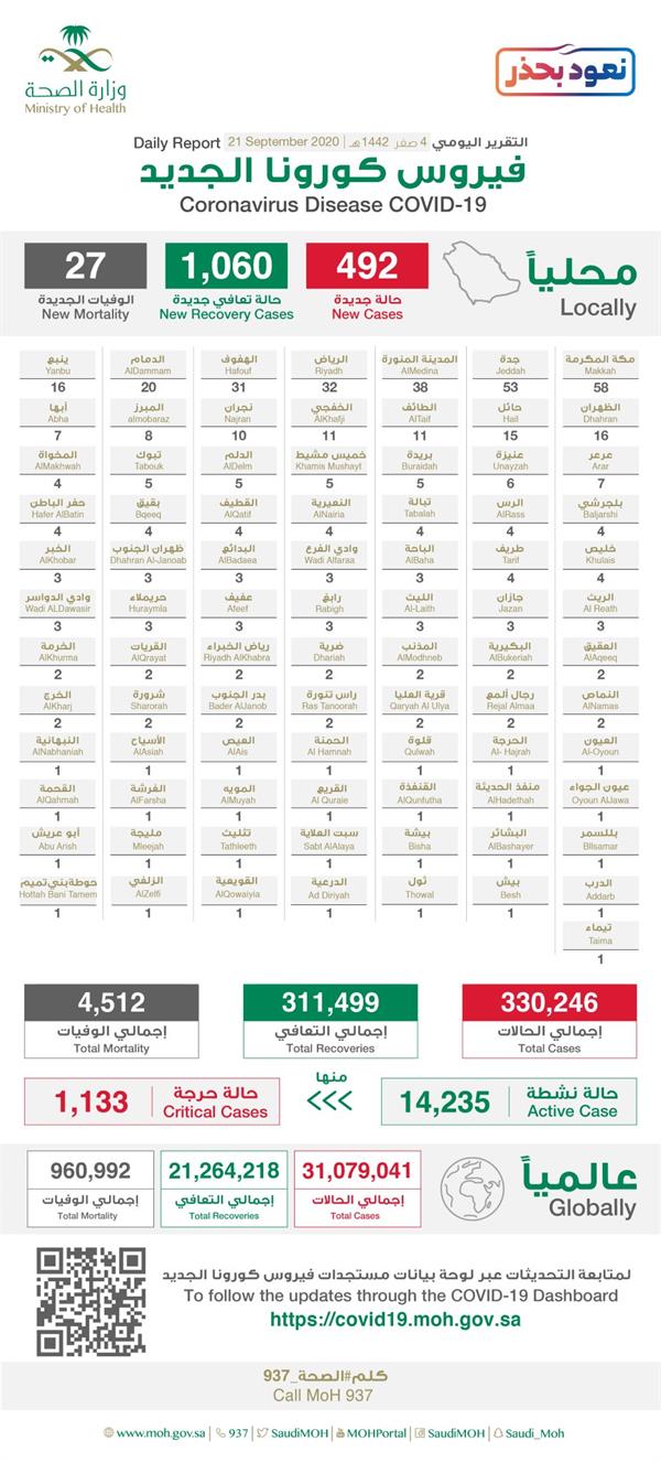ويوضح الجدول المرفق توزيع الحالات الجديدة في مدن المملكة، وكذلك أعداد الإصابة والتعافي والوفيات عالمياً.