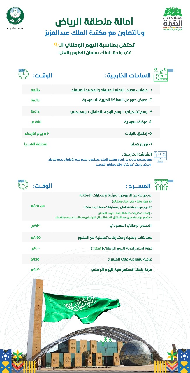 كما تقيم أمانة الرياض وبالتعاون مع مكتبة الملك عبدالعزيز فعاليّات متنوعة في واحة الملك سلمان للعلوم بالعليا اليوم وغدًا من الساعة الـ5 مساءً وحتى الـ10 مساءً تحت شعار “مجتمع واعٍ”، تشمل حافلات مصادر التعلم، والمكتبة المتنقلة، ومعرض مصور عن المملكة، والعرضة السعودية، ورسم تشكيلي ورملي، ورسومات على وجوه الأطفال، وإطلاق للبالونات، وتوزيع للهدايا، ومسابقات وطنية، وفرق استعراضية احتفالية.