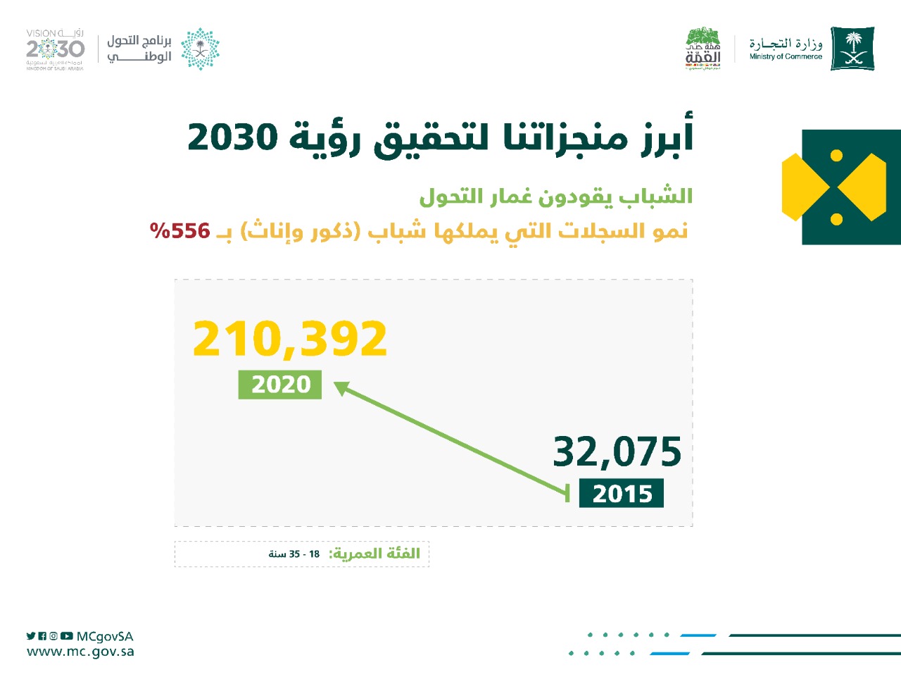 تحل الذكرى التسعون لتوحيد المملكة وبلادنا تنعم بتطور وازدهار كبير في شتى المجالات، حيث يحضى قطاع التجارة باهتمام القيادة ايدها الله، مما اسهم في تسهيل إجراءات بدء العمل التجاري، وتمكين المرأة، وجذب الاستثمارات الأجنبية، في زيادة نوعية في سجلات القطاعات النوعية، والسجلات المملوكة للشباب(ذكور، وإناث) للفئة العمرية من 18 إلى 35 سنة، والسجلات النسائية، وسجلات المستثمرين الأجانب.