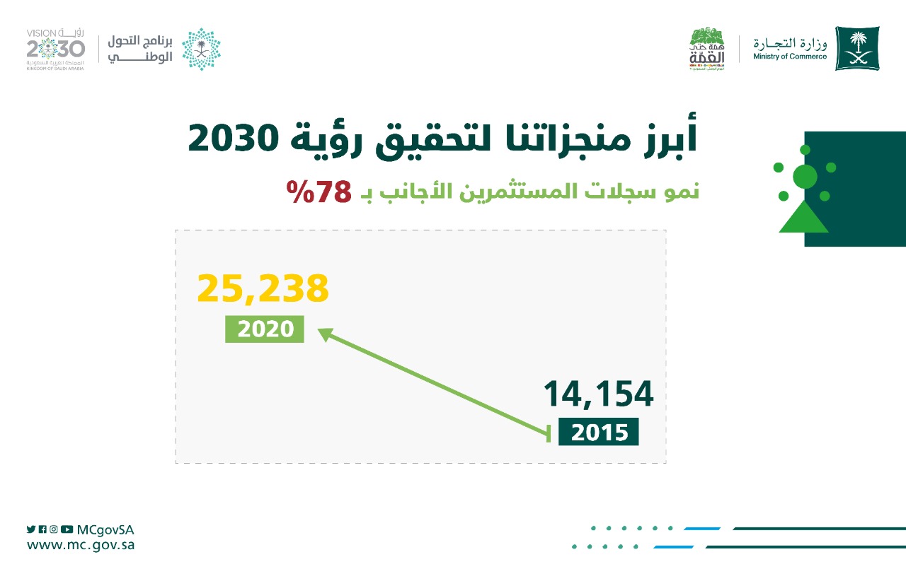 وحققت سجلات المستثمرين الأجانب نموا بنسبة 78٪ خلال العام 2020، ليبلغ عدد سجلات المستثمرين الأجانب 25،238 سجل، مقارنة مع 14،154 سجل خلال العام 2015.