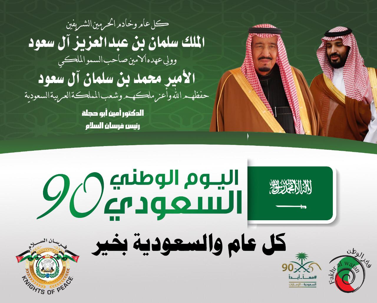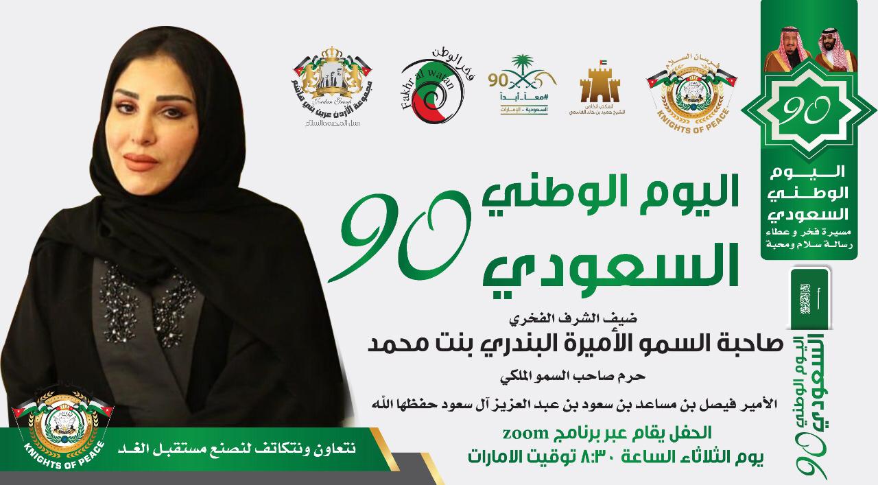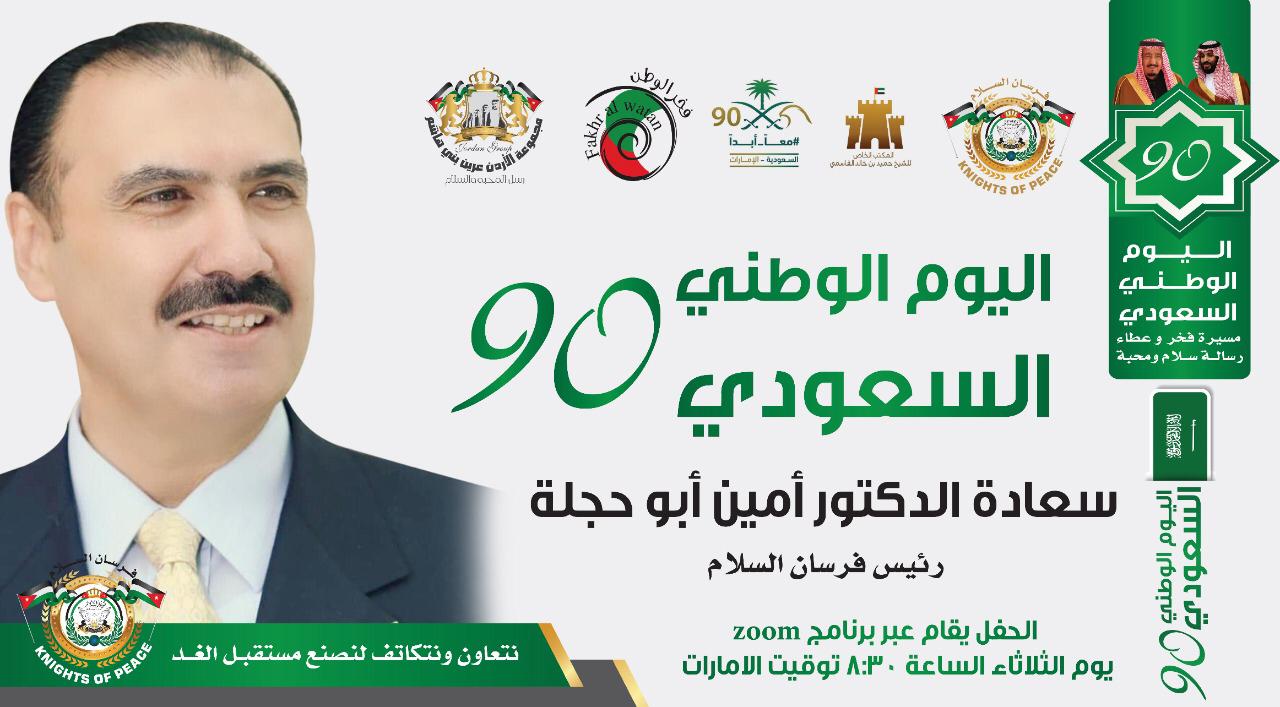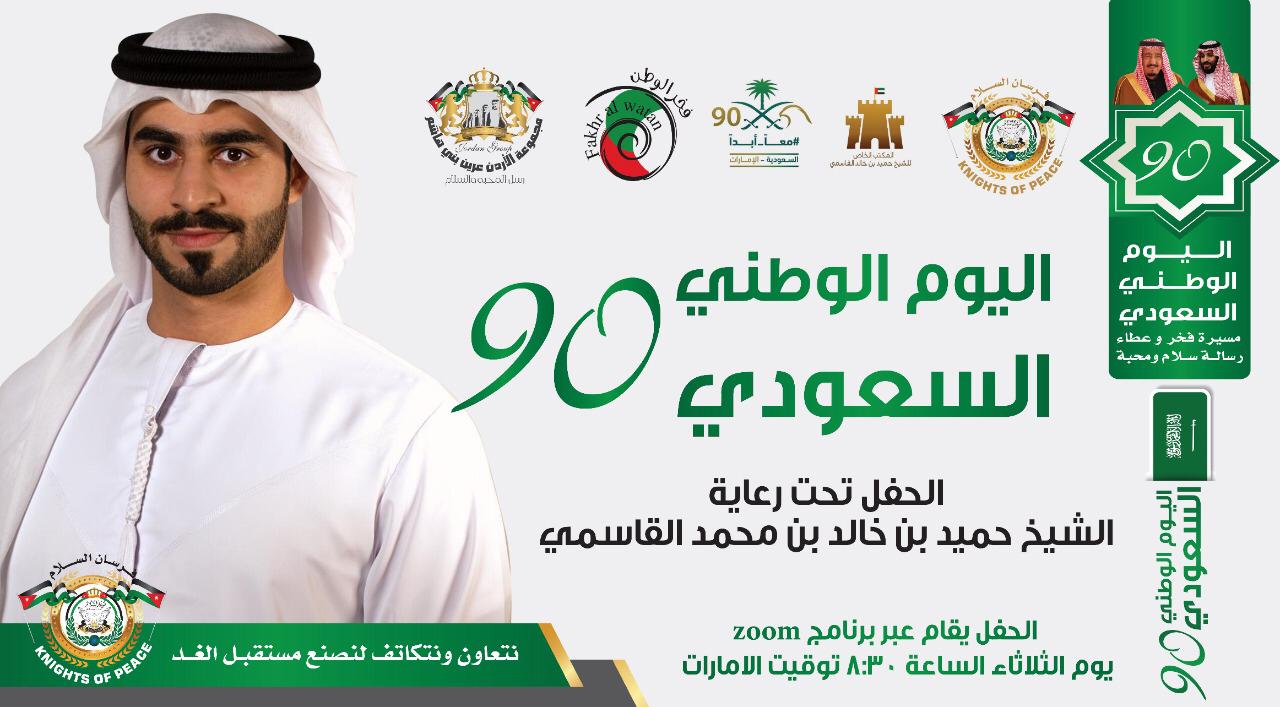 أقيم حفل اليوم الوطني السعودي التسعون ” 90 ” تحت رعاية الشيخ / حميد بن خالد القاسمي – و بحضور ضيف الشرف الفخري سمو الأميرة / البندري بنت محمد ‘ حرم صاحب السمو الملكي الأمير / فيصل بن مساعد بن سعود بن عبد العزيز آل سعود – حفظها الله ، و سعادة الدكتور / أمين أبو حجلة – ( رئيس فرسان السلام ) – ، بثنائية مشتركة بين المملكة الأردنية الهاشمية و دولة الإمارات العربية المتحدة .