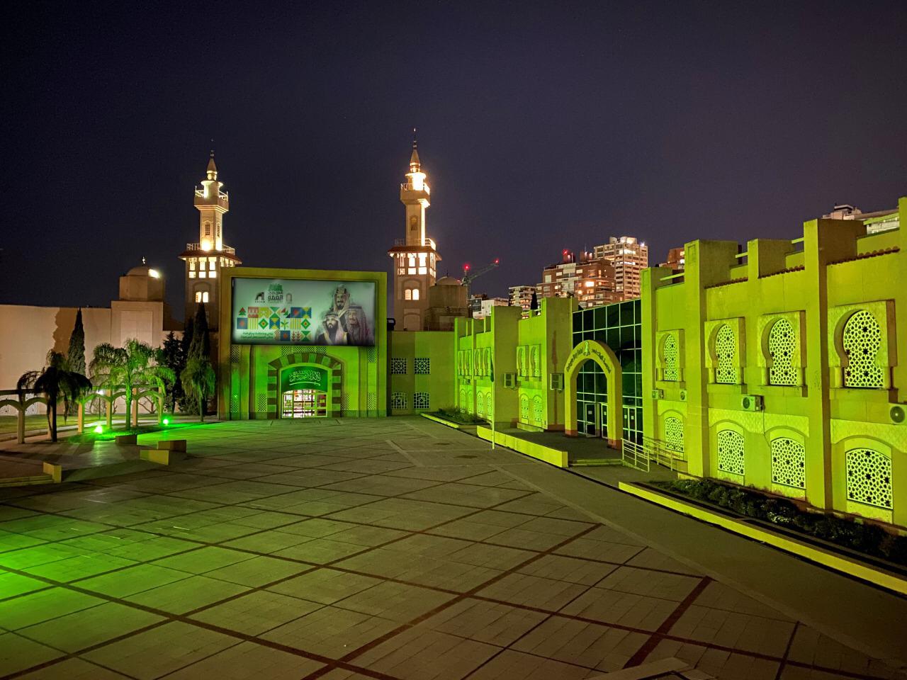 توشح أكبر مركز إسلامي بأمريكا اللاتينية ودول البحر الكاريبي مركز خادم الحرمين الشريفين الملك فهد بالعاصمة الأرجنتينية بيونس آيروس باللون الأخضر تزامنا مع الذكرى التسعين لتوحيد المملكة على يد الملك المؤسس – طيب الله ثراه -، في إطار برامج وفعاليات وزارة الشؤون الإسلامية عبر المراكز التي تشرف عليها بدول العالم .