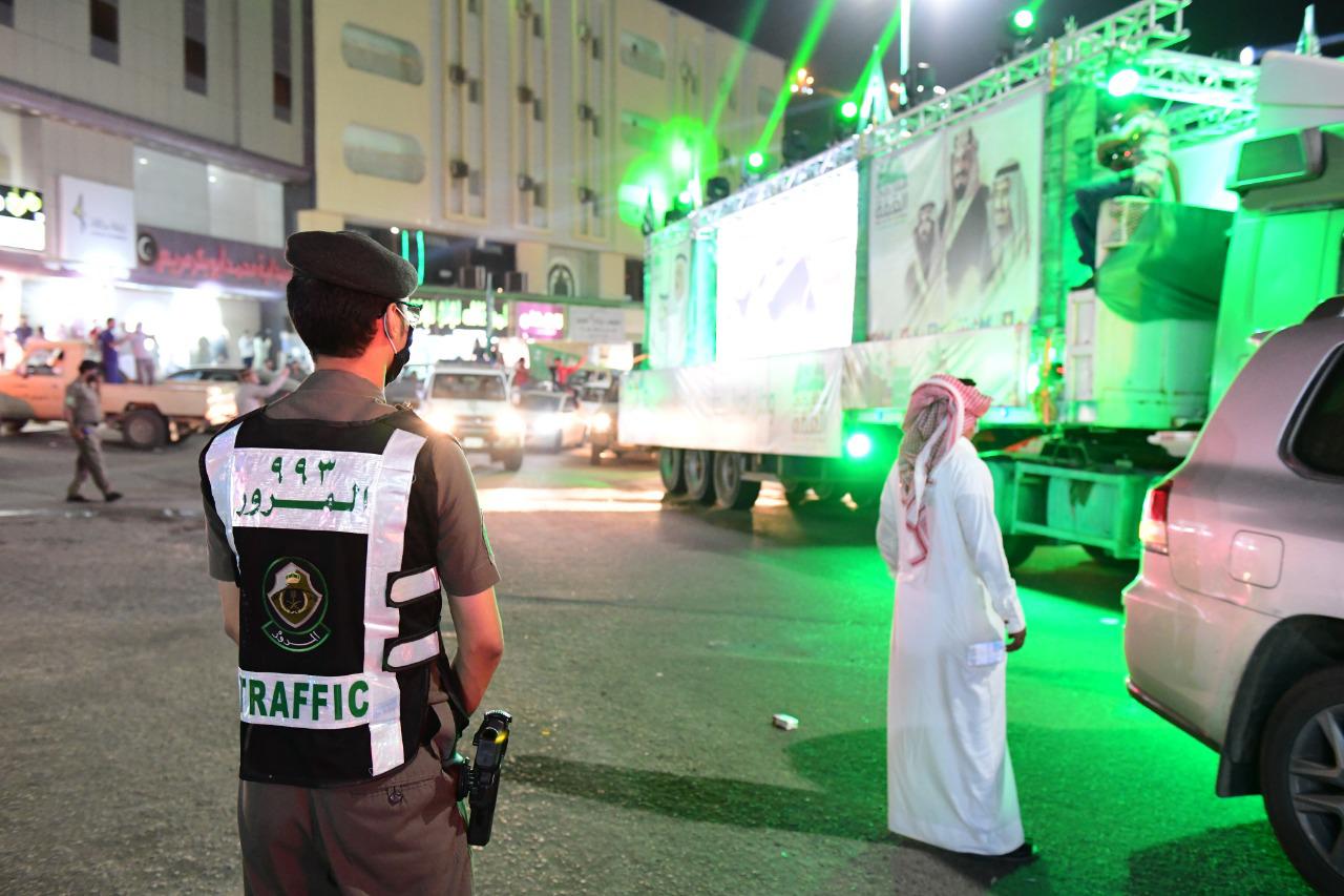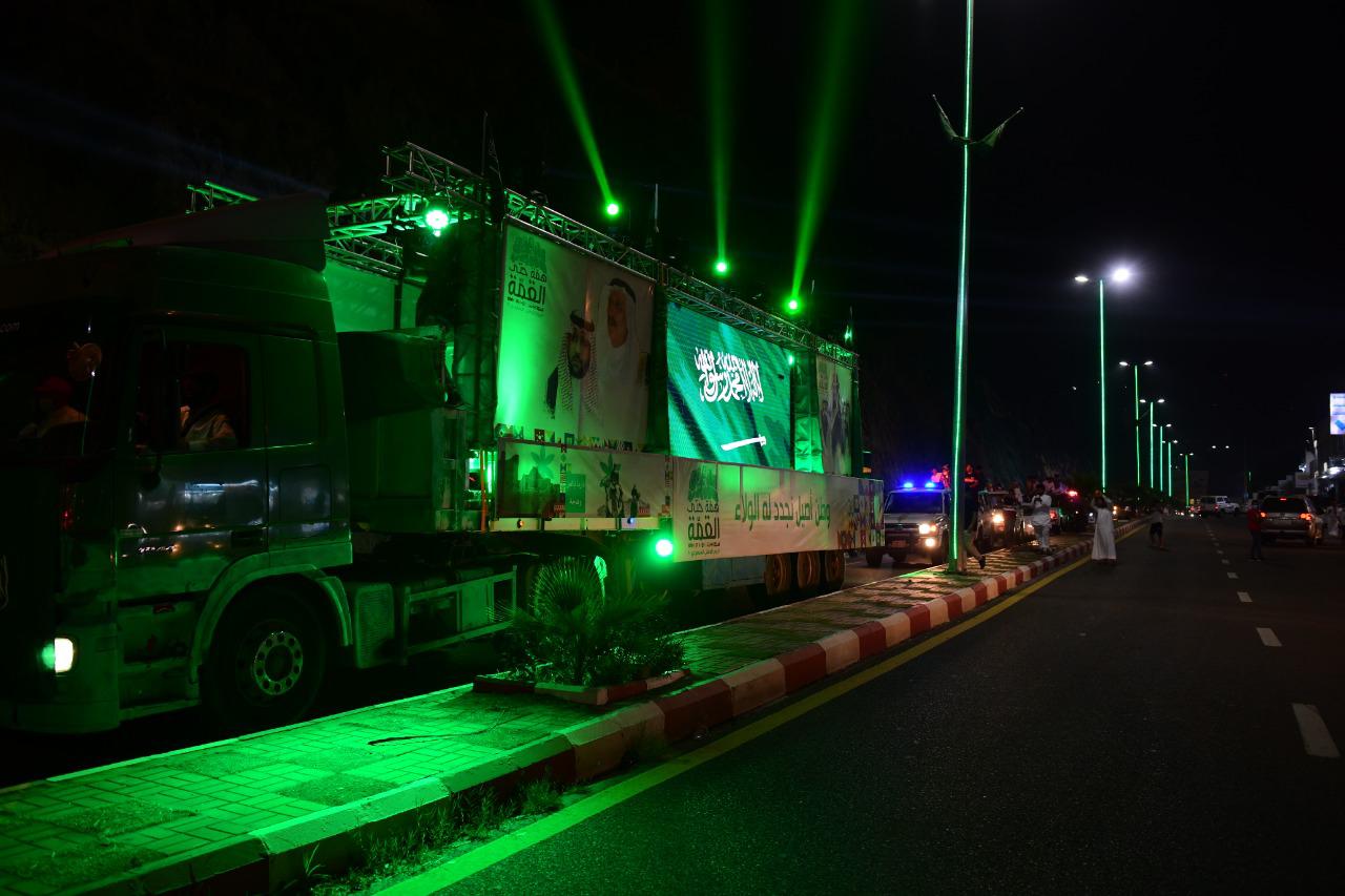 واستعرضت العربة صور المؤسس الملك عبد العزيز بن عبدالرحمن آل سعود- رحمه الله – وصور خادم الحرمين الشريفين الملك سلمان بن عبدالعزيز آل سعود وسمو ولي عهده الأمين – حفظهما الله – ، إضافة إلى بث الأناشيد الوطنية التي حظيت بمشاركة فاعلة من مختلف أطياف المجتمع .